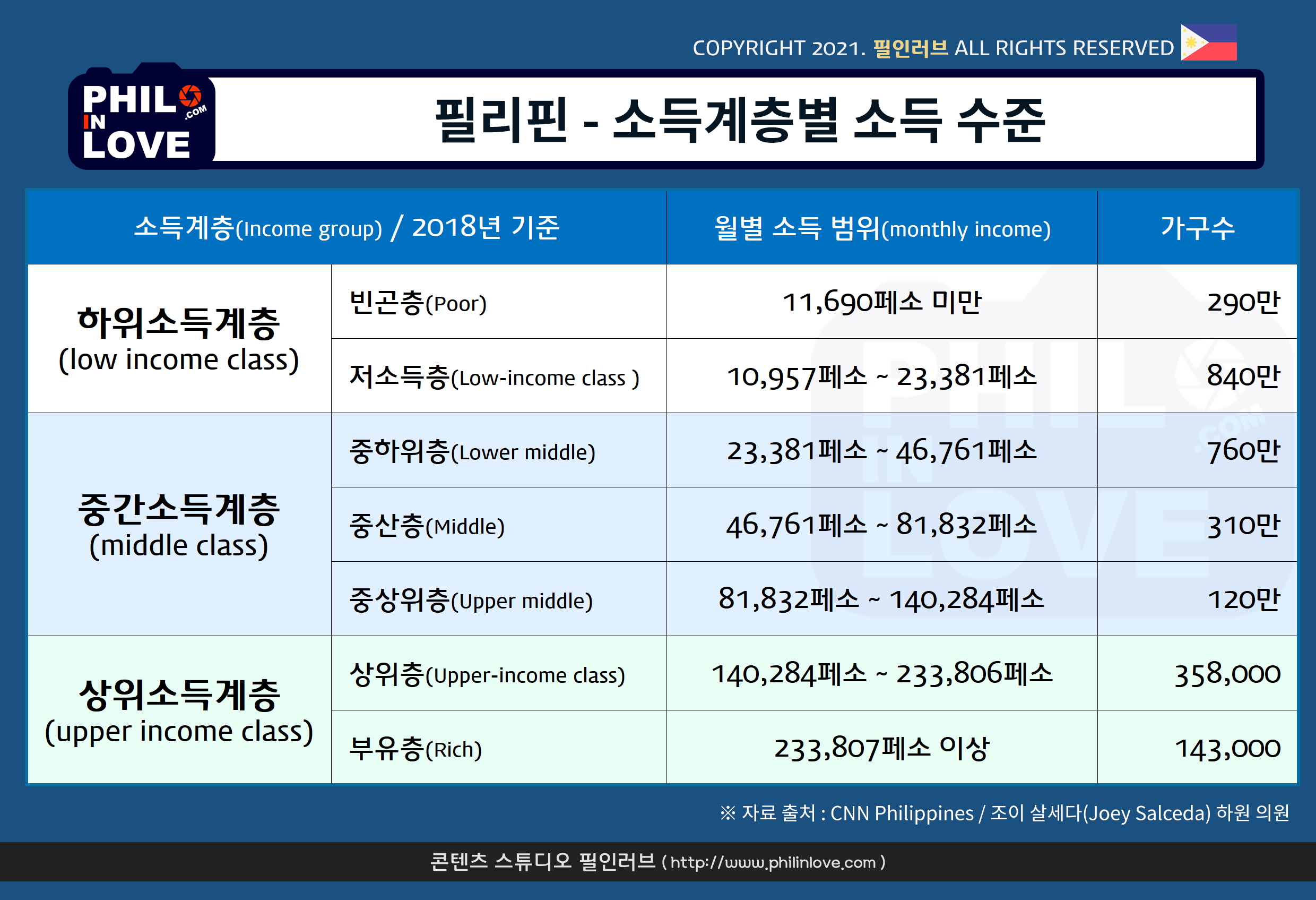 - 조이 살세다 의원의 보고서에 따르면 140,284페소(한화 322만 원) 이상 소득이 있어야 필리핀에서 상위소득계층(upper income class)으로 분류될 있다. 전체 가구 중 상위소득계층은 약 2%밖에 되지 않는다.