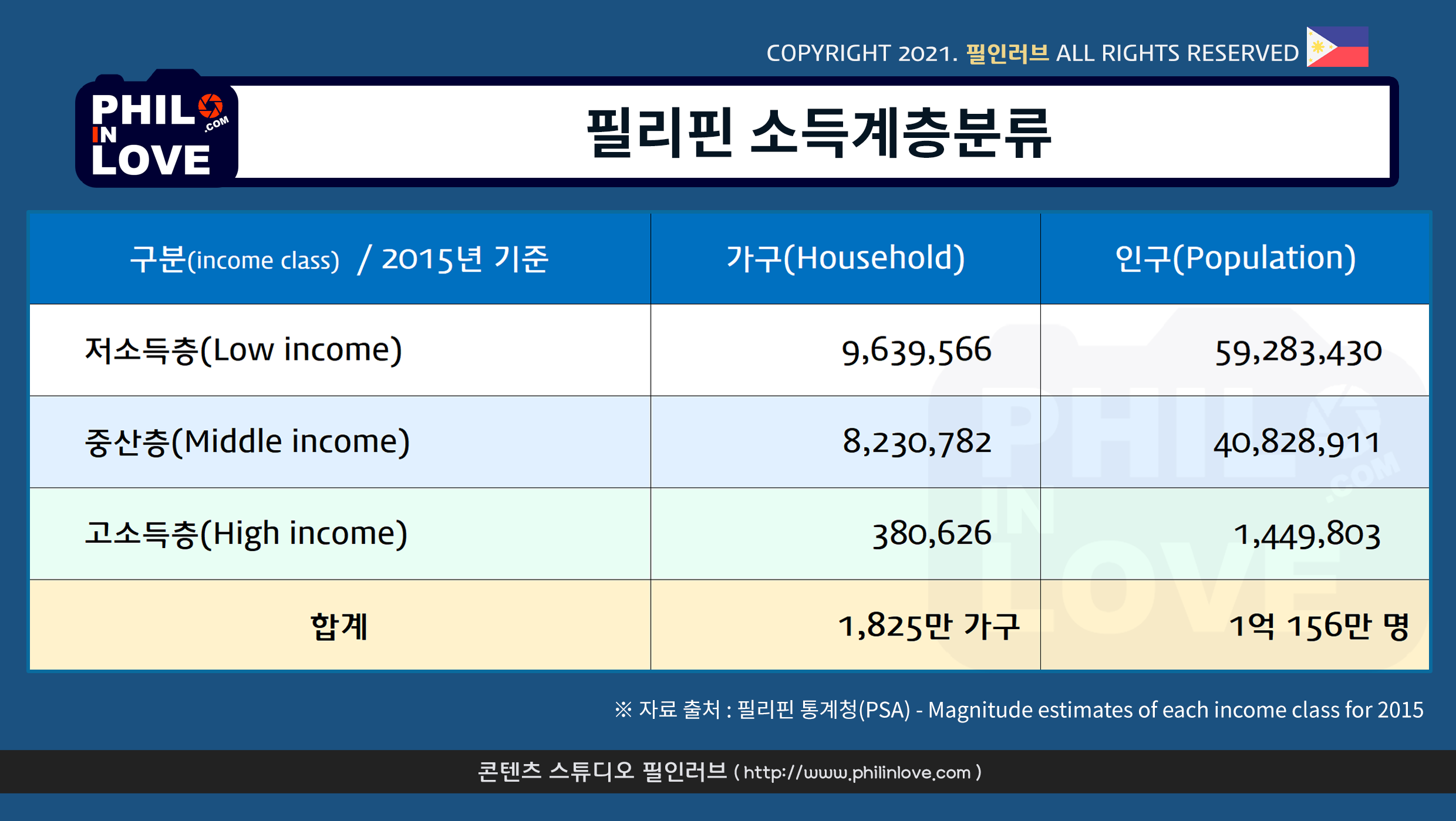 필리핀 통계청(PSA)에서는 2015년을 기준으로 중산층의 규모를 아래와 같이 파악했다.