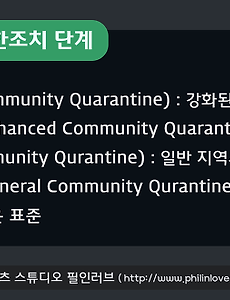 전체보기2895 [주 필리핀 대한민국 대사관] 한국 입국 필리핀인(외국인) 확진자에 대한 치료비 지원 정책 변경 오늘(8월 17일)부터 신종 코로나바이러스 감염증(코로나19) 해외유입 외국인 확진자가 한국 방역당국의 수칙을 위반하면 치료비 전액을 본인이 부담하도록 한다는 반가운 소식이다. 입국 후 검역 또는 격리 과정에서 확진 판정을 받은 외국인이 격리 명령을 비롯한 각종 조처를 따르지 않거나 코로나19 음성검사서를 허위로 제출하는 등의 사실이 확인될 경우 당사자들에게 치료비 전액을 물리도록 하겠다는 것이다. 그동안 대한민국 정부에서는 코로나19 감염의 확산 및 추가 피해를 막기 위해 입국 후 확진된 외국인에 대해서도 검사비와 치료비를 지원해왔다. 하지만 감염병예방법(감염병의 예방 및 관리에 관한 법률) 개정으로 외국인 감염병 환자에 대한 비용 부과 근거가 생겼으니, 앞으로 8월 24일부터는 확진자의 국적에 따라 .. 2020. 8. 17. 필리핀 코로나19 확진자 현황 지역별 보기 (8월 17일 현재) ■ 필리핀 코로나19 발생 현황 (8월 17일 현재)- 신종 코로나바이러스 감염증(코로나19)는 2019년 12월 중국 후베이성 우한시에서 시작되었다. 화난수산시장(우한 시장)이 바이러스 발원지로 여겨지고 있다. - 누적검사수 : 2,071,375 ① 확진환자(양성) : 164,474명 (전일대비 +3,314)② 사망 : 2,681명 (전일대비 +18) ③ 회복(음성) : 112,759명 (전일대비 +237)④ Active Case : 49,034명※ Active Case : 사망자와 회복환자를 제외한 확진자 수/ 확정 판정을 받은 뒤 의료기관에 있거나 자가격리 중인 환자※ 관련 글 보기 : [필리핀 코로나19 발생 현황] 확진자 사망자 완치자 날짜별 정리 (매일 업데이트) ■ 필리핀 코로나19 확진자 .. 2020. 8. 17. [필리핀 클락] 클락국제공항 이용 전 격리시설(호텔) 예약 필수! 검역국(BOQ) 지정 호텔 목록 코로나19 상황이 좀 나아져서 입국 규정이 완화되어도 시원찮을 판국에 필리핀 입국하기가 점점 까다로워지고 있다. 필리핀 입국 허용 대상에 해당한다고 해도 준비해야 할 것이 많으니 하는 이야기이다. 얼마 전에는 필리핀 이민국에서 필리핀 국적자의 배우자 및 자녀라고 해도 비자가 있어야만 입국할 수 있다고 하더니, 어제(8월 15일) 필리핀 교통국에서는 공항 이용객에게 마스크와 함께 얼굴 가리개(페이스 쉴드)를 의무적으로 착용해야만 한다고 나섰다. 그리고 오늘, 클락국제공항(CRK)에서는 코로나 검사 및 격리시설(필리핀 검역국 지정 호텔)을 예약해야만 필리핀 입국이 가능하도록 입국 규정을 바꾸었다. 이에 따라 클락공항 이용객들은 미리 격리 호텔을 예약해야만 필리핀 입국이 가능해진다. 인천공항 수속 시 해당 호.. 2020. 8. 16. 필리핀 코로나19 확진자 현황 지역별 보기 (8월 16일 현재) ■ 필리핀 코로나19 발생 현황 (8월 16일 현재)- 신종 코로나바이러스 감염증(코로나19)는 2019년 12월 중국 후베이성 우한시에서 시작되었다. 화난수산시장(우한 시장)이 바이러스 발원지로 여겨지고 있다. - 누적검사수 : 2,037,516 ① 확진환자(양성) : 161,253명 (전일대비 +3,420)② 사망 : 2,665명 (전일대비 +65) ③ 회복(음성) : 112,586명 (전일대비 +40,397)④ Active Case : 46,002명 ※ Active Case : 사망자와 회복환자를 제외한 확진자 수/ 확정 판정을 받은 뒤 의료기관에 있거나 자가격리 중인 환자※ 관련 글 보기 : [필리핀 코로나19 발생 현황] 확진자 사망자 완치자 날짜별 정리 (매일 업데이트) ■ 필리핀 코로나19 .. 2020. 8. 16. 필리핀 코로나19 확진자 현황 지역별 보기 (8월 15일 현재) ■ 필리핀 코로나19 발생 현황 (8월 15일 현재)- 신종 코로나바이러스 감염증(코로나19)는 2019년 12월 중국 후베이성 우한시에서 시작되었다. 화난수산시장(우한 시장)이 바이러스 발원지로 여겨지고 있다. - 누적검사수 : 2,003,875 ① 확진환자(양성) : 157,918명 (전일대비 +4,351)② 사망 : 2,600명 (전일대비 +159) ③ 회복(음성) : 72,209명 (전일대비 +885)④ Active Case : 83,109명 ※ Active Case : 사망자와 회복환자를 제외한 확진자 수/ 확정 판정을 받은 뒤 의료기관에 있거나 자가격리 중인 환자※ 관련 글 보기 : [필리핀 코로나19 발생 현황] 확진자 사망자 완치자 날짜별 정리 (매일 업데이트) ■ 필리핀 코로나19 확진자.. 2020. 8. 15. [필리핀 현지 소식] GCQ, MGCQ 지역별 격리조치 단계 (8월 31일까지 적용) 오늘 오전 해리 로케(Harry Roque) 대통령 대변인의 발표에 따르면, 로드리고 두테르테 대통령이 세부시에 대한 격리조치 단계를 GCQ 단계로 분류했다는 소식이다. 필리핀 태스크포스(IATF-EID)의 결의안(IATF Resolution No. 63)에 따르면, 8월 16일부터 8월 31일까지 일로일로시티(Iloilo City)와 퀘손주(Quezon province) 그리고 누에바 에시하(Nueva Ecija) 지역은 MGCQ에서 GCQ 단계로 격리조치를 변경한다. 민다나오(Mindanao)와 나머지 지역은 MGCQ 단계를 따르게 된다. 한편, 메트로 마닐라(Metro Manila)를 비롯하여 불라칸(Bulacan), 카비테(Cavite), 라구나(Laguna), 리잘(Rizal) 지역에 대한 격리.. 2020. 8. 15. 필리핀 코로나19 확진자 현황 지역별 보기 (8월 14일 현재) ■ 필리핀 코로나19 발생 현황 (8월 14일 현재)- 신종 코로나바이러스 감염증(코로나19)는 2019년 12월 중국 후베이성 우한시에서 시작되었다. 화난수