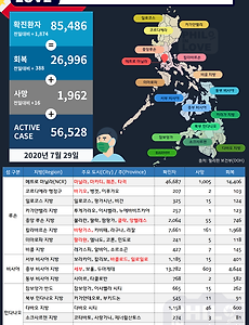 ■ 필리핀 코로나19 발생 현황 (7월 30일 현재)- 신종 코로나바이러스 감염증(코로나19)는 2019년 12월 중국 후베이성 우한시에서 시작되었다. 화난수산시장(우한 시장)이 바이러스 발원지로 여겨지고 있다. - 추가 확진자 수(3,954명)만큼이나 회복환자 수의 증가가 눈에 띈다. 특히 마닐라 지역의 회복 환자 수가 14,406명에서 34,489명으로 늘어났다. 칼라바르손 지방도 회복환자가 1,968명에서 5,127명으로 증가했다. 중부 비사야 지방은 4,644명에서 11,531명으로 회복환자가 늘었다. ① 확진환자(양성) : 89,374명 (전일대비 +3,954)② 사망 : 1,983명 (전일대비 +23) ③ 회복(음성) : 65,064명 (전일대비 +38,075)④ Active Case : 22..