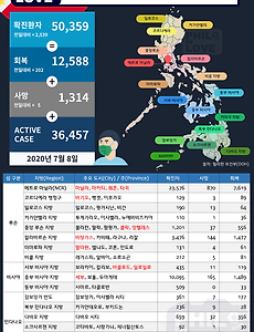 전체보기2895 한식진흥원, 해외 한식당에 한국 인테리어 소품(한국적 이미지 물품) 지원 해외에서 한식당을 운영하고 있는데 한국적 이미지 물품을 식당에 놓고 싶다면 눈여겨 볼 소식이다. 농림축산식품부 산하에서 한식 및 한식문화의 보급을 위해 운영되고 있는 한식진흥원에서 해외 한식당을 대상으로 한국적 인테리어 소품을 지원한다는 소식이다. 한식진흥원의 "2020 해외 한식당 한국적 이미지 물품지원 사업 공고"에 따르면 이번 사업은 해외 한식당 차별화 등을 위한 한국적 이미지 물품을 보급하는 것을 목적으로 진행되며, 지원 대상으로 선정되면 한국적 이미지를 활용한 물품을 지원받게 된다. 지원 대상은 전세계에 있는 한식당이며, 지원 대상은 신규 또는 리모델링 한식당(20개소)과 기존 운영 중인 해외 한식당(50개소 이상) 두 종류로 나눠 진행된다. 지원 대상에 따라 지원 물품 규모가 달라지는데 기존 .. 2020. 7. 11. 7월 13일부터 마스크 해외 발송 수량 확대. 분기별 최대 90장까지 발송 가능 한국에서 해외 거주 가족에 보내는 보건용 마스크 발송 수량이 분기별 최대 90장으로 늘어난다. 오늘 대한민국 관세청에서 발표한 바에 따르면, 자가 사용 목적으로 해외 직구하는 코로나19 방역물품(보건용·수술용 마스크·손 소독제·체온계)에 대한 한시적 '목록통관' 반입 조치가 오는 내일(7월 11일) 종료된다고 한다. 보건용 마스크 공적 공급 제도가 끝나고 정부의 마스크 수급정책이 시장형 수급관리 체계로 전환되면서 한국 내에서는 마스크 구매가 자유로운 상황에서 재외국민의 안전을 위한 조치이다. 이 조치가 종료됨에 따라 국제우편(EMS)을 통해 해외 발송 가능한 마스크 발송 수량이 분기별 90장( 최대 수량)으로 늘어난다. 기존에는 '1인 주당 3장' 기준 3개월 치 36장까지 해외 발송이 가능했지만, 7월.. 2020. 7. 10. [필리핀 현지 소식] 지도로 보는 코로나19 확진자 현황 - 메트로 마닐라 지역 (7월 10일 현재) ■ 필리핀 코로나19 발생 현황 (7월 10일 현재)- 신종 코로나바이러스 감염증(코로나19)는 2019년 12월 중국 후베이성 우한시에서 시작되었다. 화난수산시장(우한 시장)이 바이러스 발원지로 여겨지고 있다. ① 확진환자(양성) : 52,914명 (전일대비 +1,233)② 사망 : 1,360명 (전일대비 +42) ③ 회복(음성) : 13,230명 (전일대비 +286) * 누적검사수 : 911,680 (7월 8일 현재)■ 메트로 마닐라 코로나19 확진자 현황※ 자료 출처 : 시(City) 또는 구(Municipality)에서 운영하는 페이스북 페이지 ■ 필리핀 코로나19 확진자 지역별 현황 (7월 10일 현재)- 이 자료는 필리핀 보건부의 COVID-19 Tracker 발표를 기준으로 정리되었다. 주(.. 2020. 7. 10. [필리핀 현지 소식] 지역별 코로나19 확진자 현황 - 필리핀 전체 지역 (7월 9일 현재) ■ 필리핀 코로나19 발생 현황 (7월 9일 현재)- 신종 코로나바이러스 감염증(코로나19)는 2019년 12월 중국 후베이성 우한시에서 시작되었다. 화난수산시장(우한 시장)이 바이러스 발원지로 여겨지고 있다. ① 확진환자(양성) : 51,754명 (전일대비 +1,395)② 사망 : 1,318명 (전일대비 +4) ③ 회복(음성) : 12,944명 (전일대비 +354) * Active Case : 37,492* 누적검사수 : 885,882 (7월 7일 현재) ■ 메트로 마닐라 코로나19 확진자 현황 : 총 22,240명 (전일대비 +444) ■ 필리핀 코로나19 확진자 지역별 현황 (7월 9일 현재)- 이 자료는 필리핀 보건부의 COVID-19 Tracker 발표를 기준으로 정리되었다. 주(Province.. 2020. 7. 9. [필리핀 현지 소식] 지역별 코로나19 확진자 현황 - 필리핀 전체 지역 (7월 8일 현재) ■ 필리핀 코로나19 발생 현황 (7월 8일 현재)- 신종 코로나바이러스 감염증(코로나19)는 2019년 12월 중국 후베이성 우한시에서 시작되었다. 화난수산시장(우한 시장)이 바이러스 발원지로 여겨지고 있다. ① 확진환자(양성) : 50,359명 (전일대비 +2,539)② 사망 : 1,314명 (전일대비 +5) ③ 회복(음성) : 12,588명 (전일대비 +202) * Active Case : 36,457* 누적검사수 : 910,694 (7월 8일 현재) ■ 메트로 마닐라 코로나19 확진자 현황 : 총 23,576명 (전일대비 +1,066) ■ 필리핀 코로나19 확진자 지역별 현황 (6월 21일 현재)- 이 자료는 필리핀 보건부의 COVID-19 Tracker 발표를 기준으로 정리되었다. 주(Provi.. 2020. 7. 8. [필리핀 현지 소식] 지역별 코로나19 확진자 현황 - 필리핀 전체 지역 (7월 7일 현재) ■ 필리핀 코로나19 발생 현황 (7월 7일 현재)- 신종 코로나바이러스 감염증(코로나19)는 2019년 12월 중국 후베이성 우한시에서 시작되었다. 화난수산시장(우한 시장)이 바이러스 발원지로 여겨지고 있다. ① 확진환자(양성) : 47,873명 (전일대비 +1,540)② 사망 : 1,309명 (전일대비 +6) ③ 회복(음성) : 12,386명 (전일대비 +201)* Active Case : 34,178* 누적검사수 : 885,882 ■ 메트로 마닐라 코로나19 확진자 현황 : 총 22,314명 (전일대비 +777) ■ 필리핀 코로나19 확진자 지역별 현황 (7월 7일 현재)- 이 자료는 필리핀 보건부의 COVID-19 Tracker 발표를 기준으로 정리되었다. 주(Province) 또는 시(City).. 2020. 7. 7. [필리핀 물가] 3월~7월, 메트로 마닐라 지역 채소 가격 변화 ■ 필리핀의 채소 가격- 아래 가격은 깔띠마 시장(Cartimar Market)의 제주상회 판매 가격을 기준으로 작성되었다. - 마닐라 파사이에 있는 깔띠마 시장은 도매시장이라