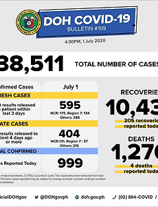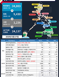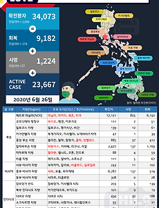 전체보기2895 [필리핀 현지 소식] 지역별 코로나19 확진자 현황 - 필리핀 전체 지역 (7월 3일 현재) ■ 필리핀 코로나19 발생 현황 (7월 3일 현재)- 신종 코로나바이러스 감염증(코로나19)는 2019년 12월 중국 후베이성 우한시에서 시작되었다. 화난수산시장(우한 시장)이 바이러스 발원지로 여겨지고 있다. ① 확진환자(양성) : 40,336명 (전일대비 +1,531)② 사망 : 1,280명 (전일대비 +6) ③ 회복(음성) : 11,073명 (전일대비 +400) * Active Case : 27,983* 누적검사수 : 762,632 (7월 1일 현재) ■ 메트로 마닐라 코로나19 확진자 현황 : 총 19,420명 (전일대비 +413) ■ 필리핀 코로나19 확진자 지역별 현황 (7월 3일 현재)- 이 자료는 필리핀 보건부의 COVID-19 Tracker 발표를 기준으로 정리되었다. 주(Province.. 2020. 7. 3. [필리핀 마닐라] LTFRB, 메트로 마닐라 지역 지프니 운행 재개 허용 오늘(7월 3일)부터 메트로 마닐라(NCR) 지역 내 구형 지프니 운행이 일부 허용된다. 코로나19 때문에 루손섬 전체 지역에 강화된 지역사회 봉쇄‧격리조치(ECQ) 실시된 것이 지난 3월 17일이었으니, 109일 만에 다시 운행을 시작하게 되는 셈이다. 하지만 모든 구형 지프니(Traditional Public Utility Jeepneys)가 다시 운행을 시작하는 것은 아니다. 마리키나-파시그 노선을 비롯하여 49개 노선, 6,002대의 지프니에 대해서만 운행이 허용된다. 메트로 마닐라에는 약 55,000대의 지프니가 있다고 하니 10% 정도만이 운행을 다시 시작하게 된다고 보면 된다. 7월 2일 현재 필리핀 내 코로나19 확진자는 38,805명으로 이 중 49%에 해당하는 19,005명은 메트로 마.. 2020. 7. 3. [필리핀 현지 소식] 지역별 코로나19 확진자 현황 - 필리핀 전체 지역 (7월 2일 현재) ■ 필리핀 코로나19 발생 현황 (7월 2일 현재)- 신종 코로나바이러스 감염증(코로나19)는 2019년 12월 중국 후베이성 우한시에서 시작되었다. 화난수산시장(우한 시장)이 바이러스 발원지로 여겨지고 있다. ① 확진환자(양성) : 38,805명 (전일대비 +294)② 사망 : 1,274명 (전일대비 +4) ③ 회복(음성) : 10,673명 (전일대비 +235) * Active Case : 26,858* 누적검사수 : 738,398 (6월 30일 현재) ■ 메트로 마닐라 코로나19 확진자 현황 : 총 19,005명 (전일대비 +60) ■ 필리핀 코로나19 확진자 지역별 현황 (7월 2일 현재)- 이 자료는 필리핀 보건부의 COVID-19 Tracker 발표를 기준으로 정리되었다. 주(Province) .. 2020. 7. 2. [필리핀 현지 소식] 코로나19 확진자 38,511명, 사망자 1,270명 (7월 1일 현재) ■ 필리핀 코로나19 발생 현황 (7월 1일 현재)- 신종 코로나바이러스 감염증(코로나19)는 2019년 12월 중국 후베이성 우한시에서 시작되었다. 화난수산시장(우한 시장)이 바이러스 발원지로 여겨지고 있다. ① 확진환자(양성) : 38,511명 (전일대비 +999)② 사망 : 1,270명 (전일대비 +4) ③ 회복(음성) : 10,438명 (전일대비 +205) ※ 필리핀 보건부(DOH)에서 운영하는 COVID-19 Tracker ( https://ncovtracker.doh.gov.ph/ )의 사이트에서 7월 1일 날짜의 자료 업데이트를 하지 않음. 6월 30일 이후 바로 7월 2일 날짜의 데이터를 발표함. [필리핀 현지 소식] 코로나19 확진자 38,511명, 사망자 1,270명 (7월 1일 현재).. 2020. 7. 1. [필리핀 현지 소식] ECQ, GCQ, MGCQ 지역별 코로나19 격리조치 단계 (7월 15일까지 적용) 6월 30일, 어제는 필리핀 정부에서 루손섬 전체에 ECQ 격리조치를 적용한 지 106째 되는 날이었다. 그리고 필리핀 보건부에서 발표한 코로나19 확진자 수는 37,514명이었다. 필리핀 곳곳에 격리(봉쇄) 조치를 한 지 100일이 지났건만 코로나19 확진자 수는 눈에 띄게 늘어나고 있다. 그리고 로드리고 두테르테 대통령의 대국민 담화는 여전히 늦은 밤 슬그머니 이루어진다. 조치 적용 시간이 임박해서야 지역별 코로나19 격리조치 단계를 알려주는 일에 어떤 재미가 있는지는 모르겠으나, 필리핀 사람들도 지쳐가는 것은 확실하다. 필리핀 정부에서는 코로나19 관련 지역사회 격리조치 단계를 15일마다 조정하고 있는데, 보름마다 매번 이런 식이니 보다 좋은 결과를 얻기 위해 고심하느냐고 발표가 늦어진다는 생각은 .. 2020. 7. 1. [필리핀 현지 소식] 지역별 코로나19 확진자 현황 - 필리핀 전체 지역 (6월 30일 현재) ■ 필리핀 코로나19 발생 현황 (6월 30일 현재)- 신종 코로나바이러스 감염증(코로나19)는 2019년 12월 중국 후베이성 우한시에서 시작되었다. 화난수산시장(우한 시장)이 바이러스 발원지로 여겨지고 있다. ① 확진환자(양성) : 37,514명 (전일대비 +1,080)② 사망 : 1,266명 (전일대비 +11) ③ 회복(음성) : 10,233명 (전일대비 +277) * Active Case : 26,015* 누적검사수 : 722,356 (6월 29일 현재) ■ 메트로 마닐라 코로나19 확진자 현황 : 총 18,308명 (전일대비 +211) ■ 필리핀 코로나19 확진자 지역별 현황 (6월 30일 현재)- 이 자료는 필리핀 보건부의 COVID-19 Tracker 발표를 기준으로 정리되었다. 주(Prov.. 2020. 6. 30. [필리핀 현지 소식] 지역별 코로나19 확진자 현황 - 필리핀 전체 지역 (6월 29일 현재) ■ 필리핀 코로나19 발생 현황 (6월 29일 현재)- 신종 코로나바이러스 감염증(코로나19)는 2019년 12월 중국 후베이성 우한시에서 시작되었다. 화난수산시장(우한 시장)이 바이러스 발원지로 여겨지고 있다. ① 확진환자(양성) : 36,438명 (전일대비 +985)② 사망 : 1,255명 (전일대비 +11) ③ 회복(