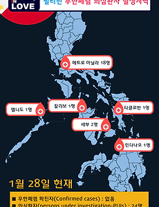 필리핀 보건부(DOH-Department of Health)에서 '우한 폐렴'으로 불리는 신종 코로나바이러스 감염으로 의심되는 환자 11명의 명단을 발표했다. 이들 11명은 메트로 마닐라, 팔라완, 민다나오, 레이테, 칼리보, 세부 지역에서 발견되었으며 모두 최근 중국 우한으로 여행한 경험이 있는 중국, 브라질, 독일 및 미국 국적의 외국인이라고 한다. 명단을 보면 세부 지역에 5세 어린이도 포함되어 있는데, 지난 12일 필리핀 세부로 입국한 중국 국적의 어린이이며, 표본 검사에서 코로나바이러스 양성 반응이 나와 격리 상태로 정밀 검사를 받고 있다고 알려져 있다. 필리핀 보건부에서는 이들에 대해 아직 신종 코로나바이러스 감염증(우한 폐렴) 확진 상태는 아니며, 조사대상자(persons under inve..