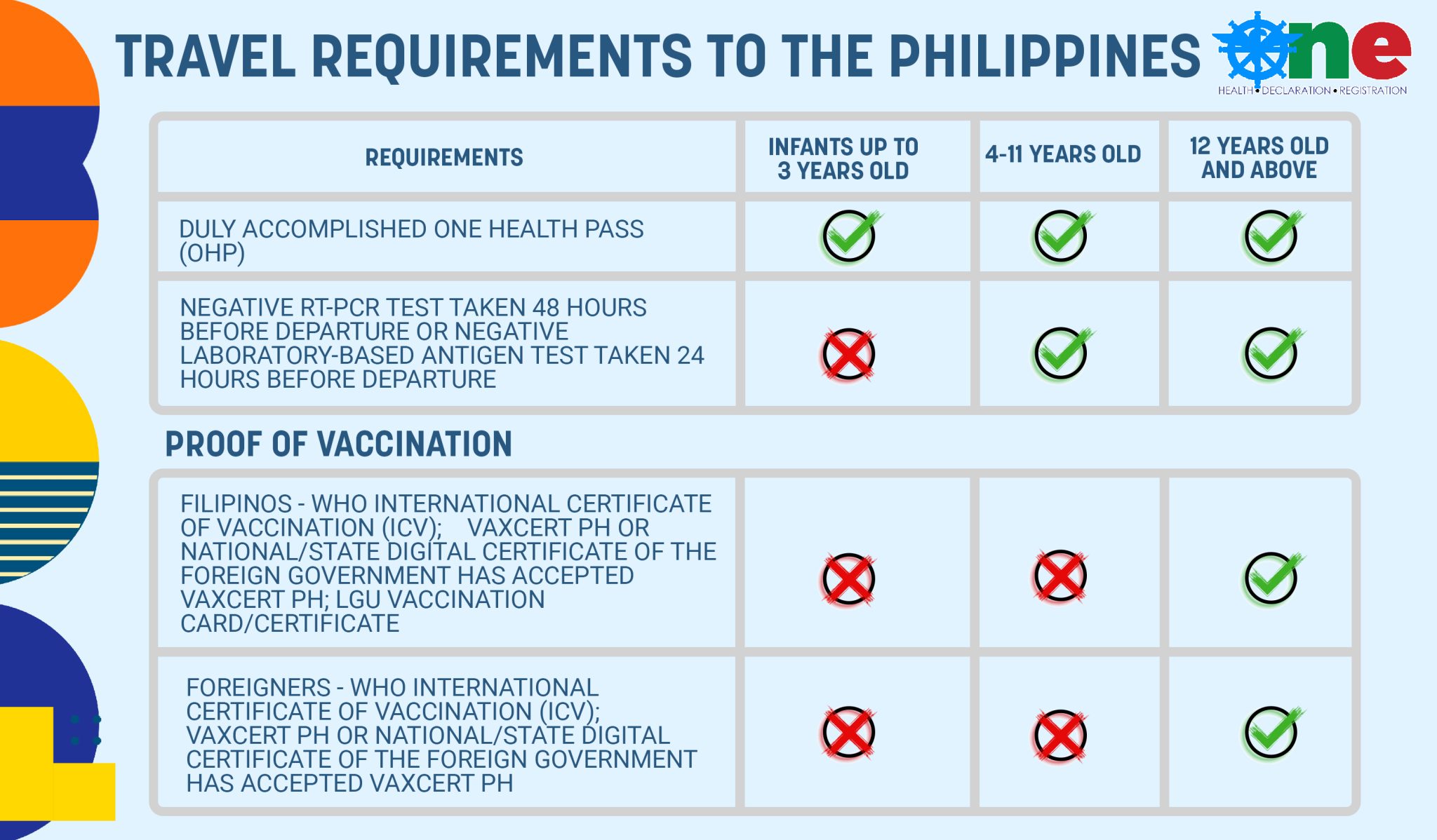 현재 필리핀 정부에서는 무비자 입국 시 음성확인서와 백신 예방접종증명서, 여행자보험, 왕복항공권 등을 제출하도록 하고 있다. 어린아이의 경우 백신접종 및 코로나19 검사가 어려운 점을 고려하여 제출 예외 대상으로 해주고 있는데 음성확인서의 경우 3세 이하인 경우, 백신접종증명서의 경우 12세 미만인 경우 제출을 면제받는다. 여행자보험과 왕복항공권 준비 및 원헬스패스 작성 등은 나이와 관계없이 누구나 준비해야만 한다.
