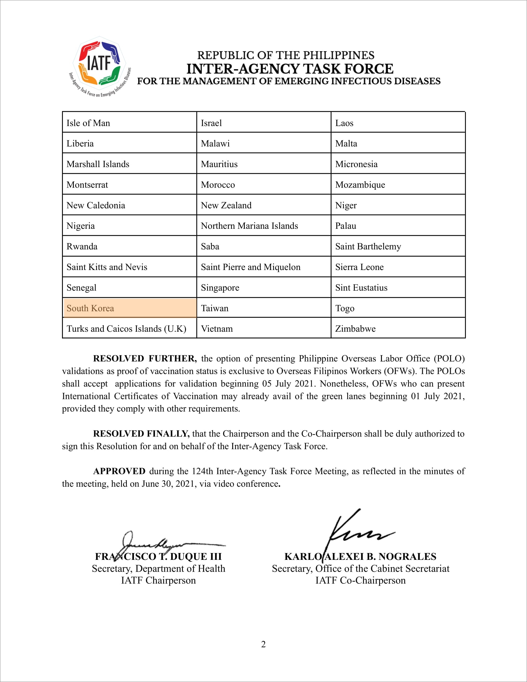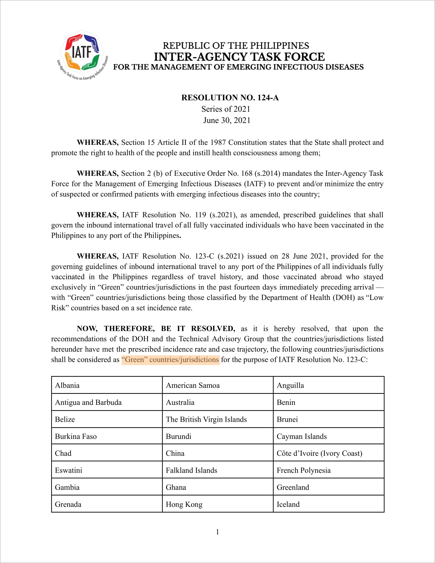 · IATF-EID(Inter-Agency Task Force for the Management of Emerging Infectious Diseases) : RESOLUTION NO. 124-A