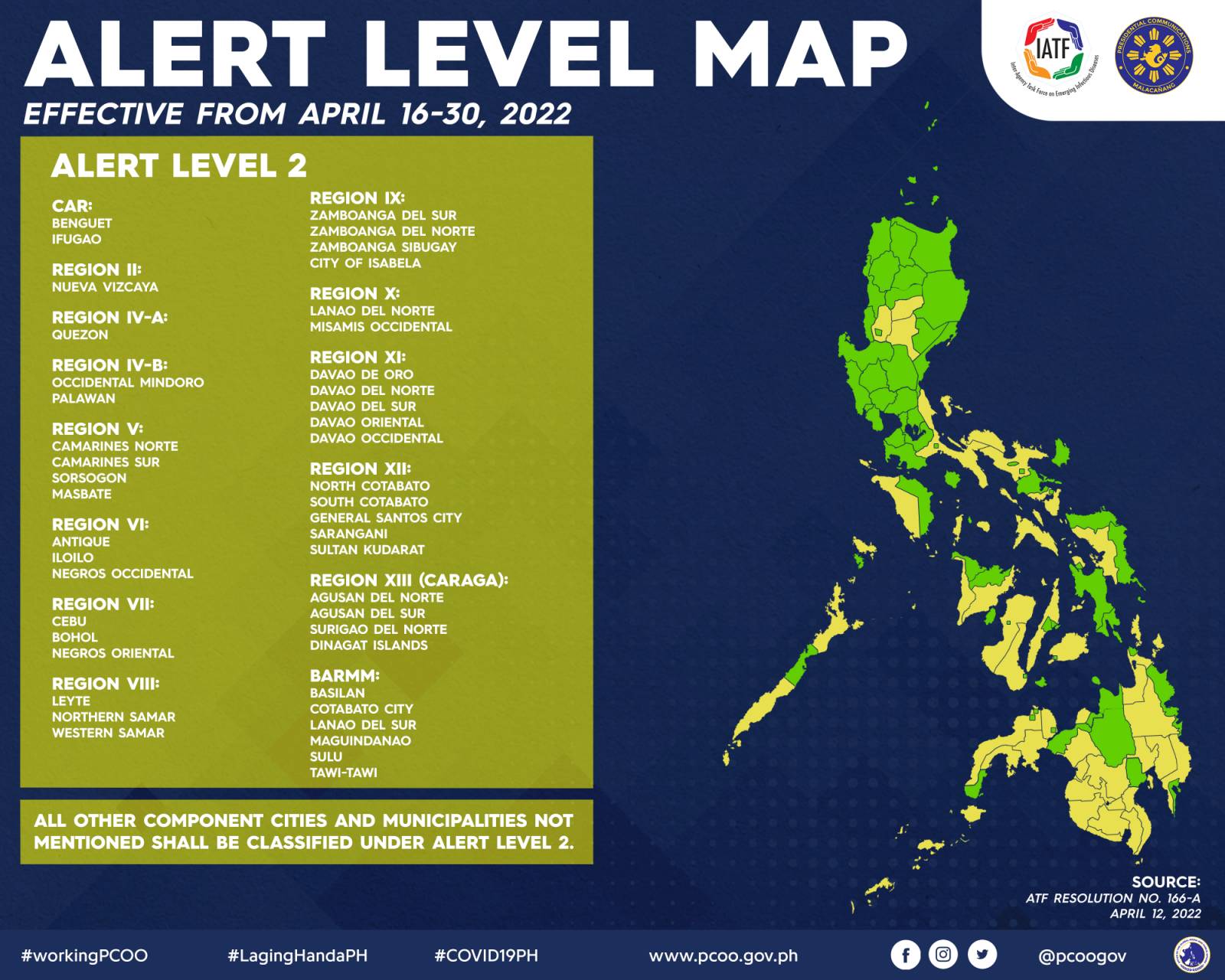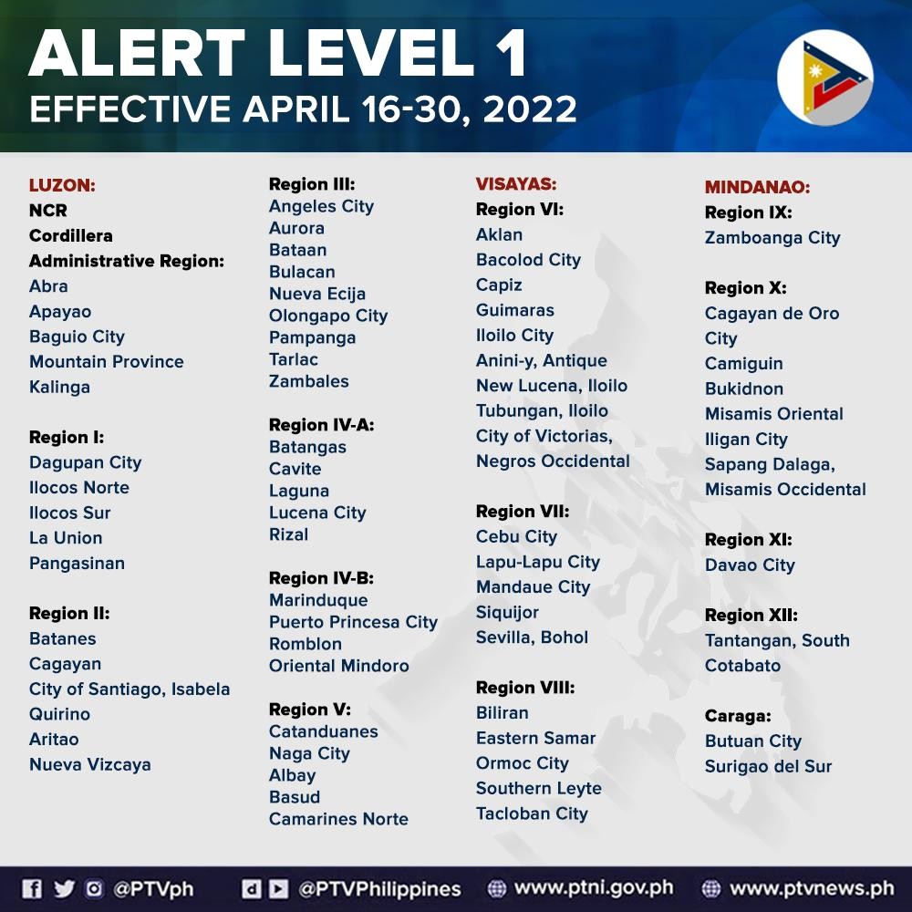 2022년 4월 16일부터 4월 30일까지 필리핀 각 지역의 경보단계시스템(COVID-19 Alert Level System)은 아래와 같이 적용된다.