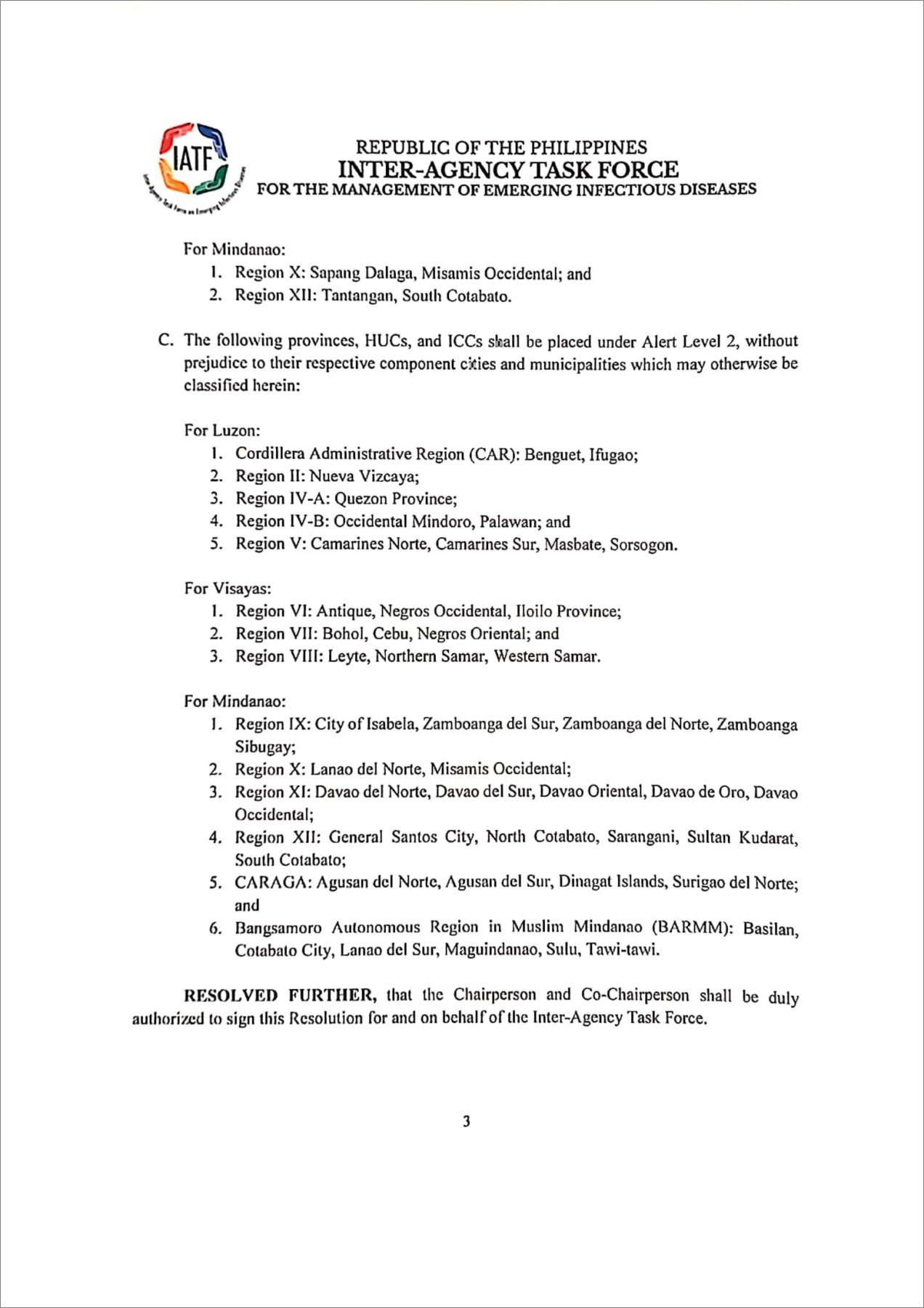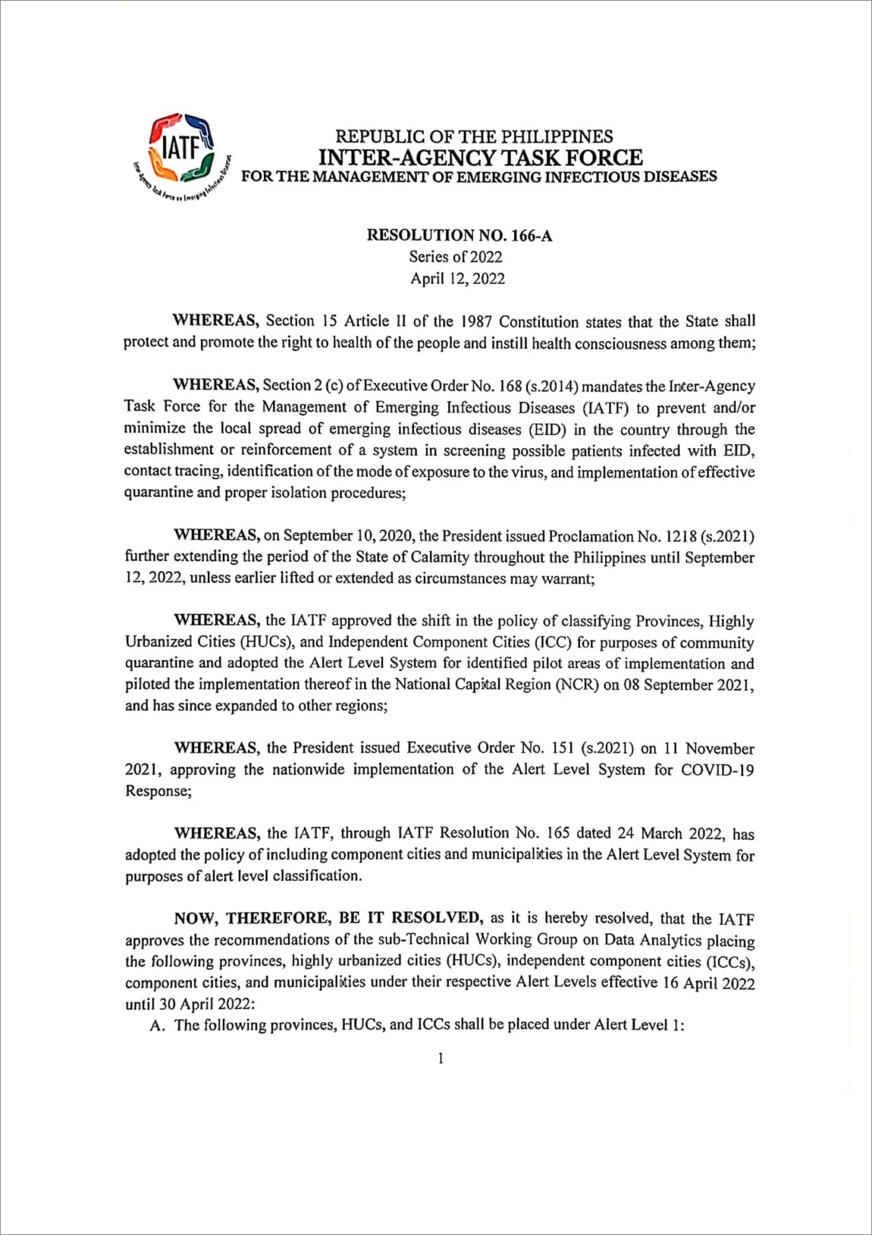 · Presidential Communications : IATF Resolution No. 166-A