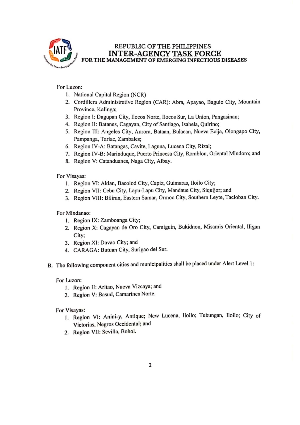 · Presidential Communications : IATF Resolution No. 166-A