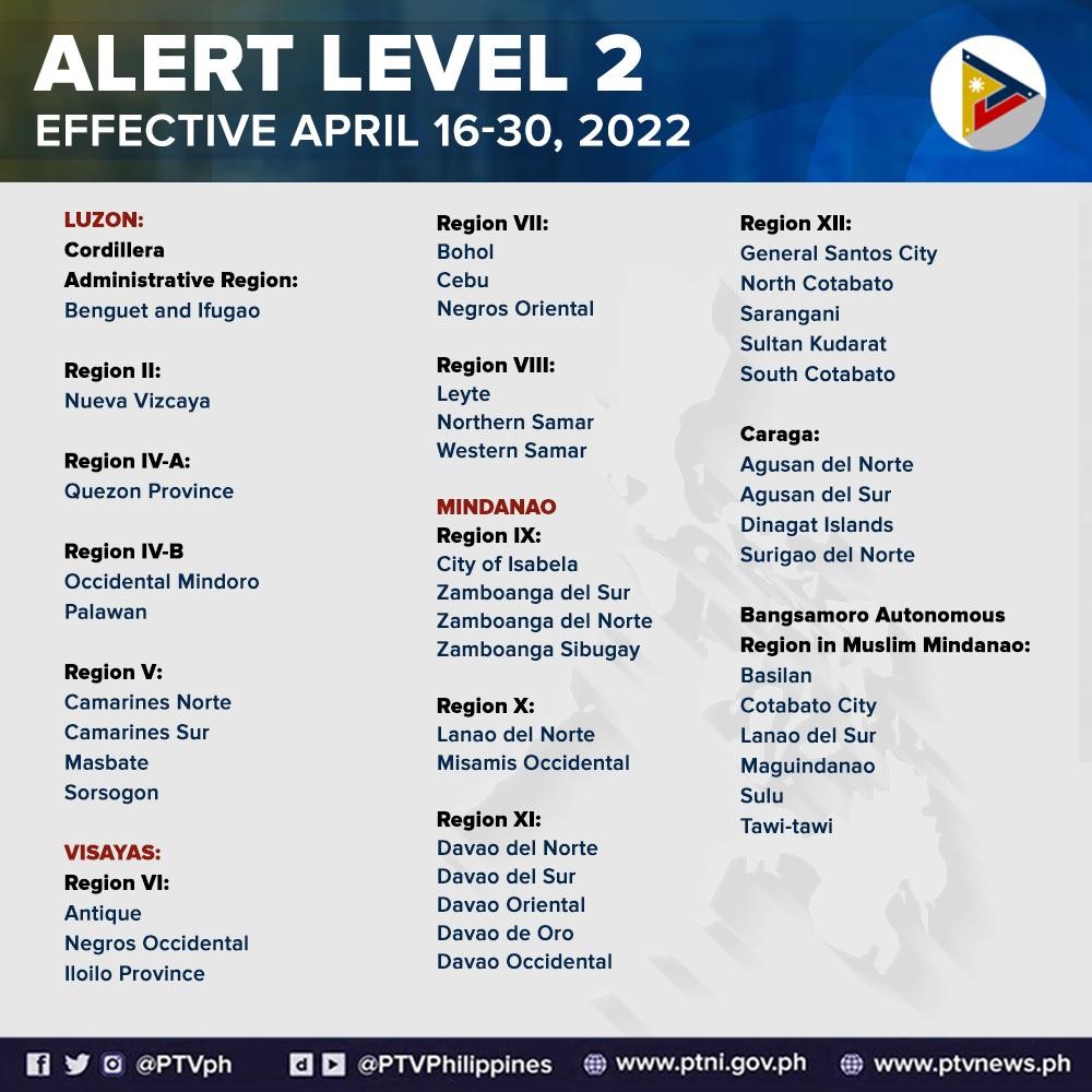 2022년 4월 16일부터 4월 30일까지 필리핀 각 지역의 경보단계시스템(COVID-19 Alert Level System)은 아래와 같이 적용된다.