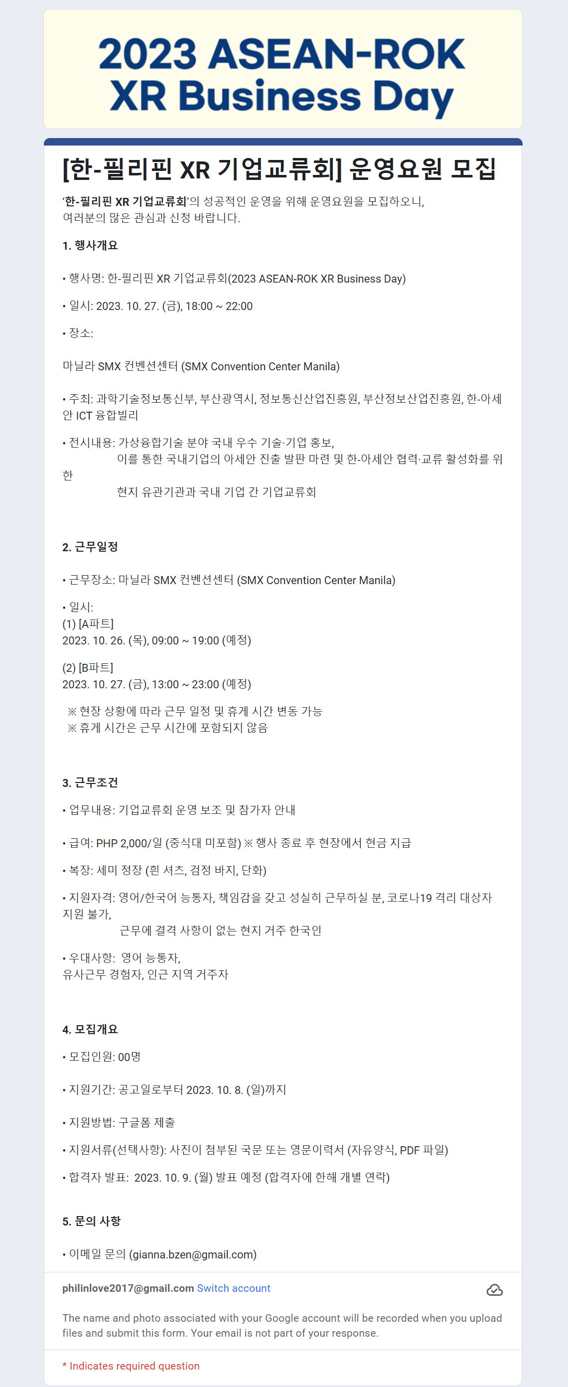 나를 황당하게 만든 구인 공고는 창조문화산업도시 부산 건설에 앞장선다는 부산정보산업진흥원에서 주최하는 행사의 운영요원 모집공고이다. 오는 10월 27일에 몰 오브 아시아의 SMX 컨벤션센터에서 열린다는 '2023 한-필리핀 XR 기업교류회'를 앞두고 행사 운영 보조를 구하는 것인데, 하루 일당이 2천 페소이다. 근무 시간은 무려 10시간. 시간당 200페소(한화 4,710원)를 받고 일하는 셈이다.