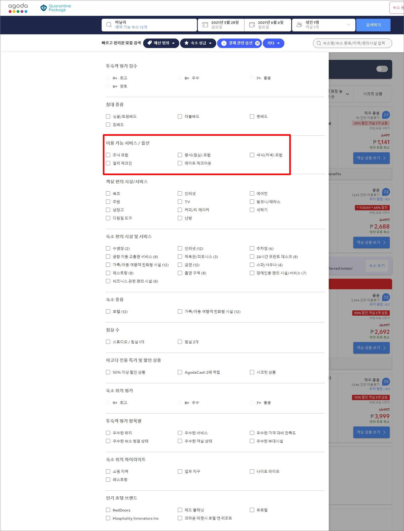 현재 아고다에서 격리 패키지로 예약 가능한 호텔은 필리핀 검역국(BOQ)에서 격리호텔 사용 승인을 받은 호텔이며, 마닐라와 세부, 앙헬레스, 클락, 바탕가스, 카비테 등으로 지역이 분류되어 있다. 격리 패키지로 숙박 예약 시 공항 픽업(airport transfer) 및 격리 기간 중 식사를 옵션으로 선택할 수 있다.