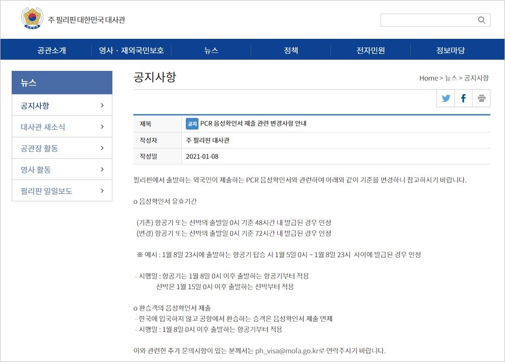 · 주 필리핀 대한민국 대사관 - PCR 음성확인서 제출 관련 변경사항 안내