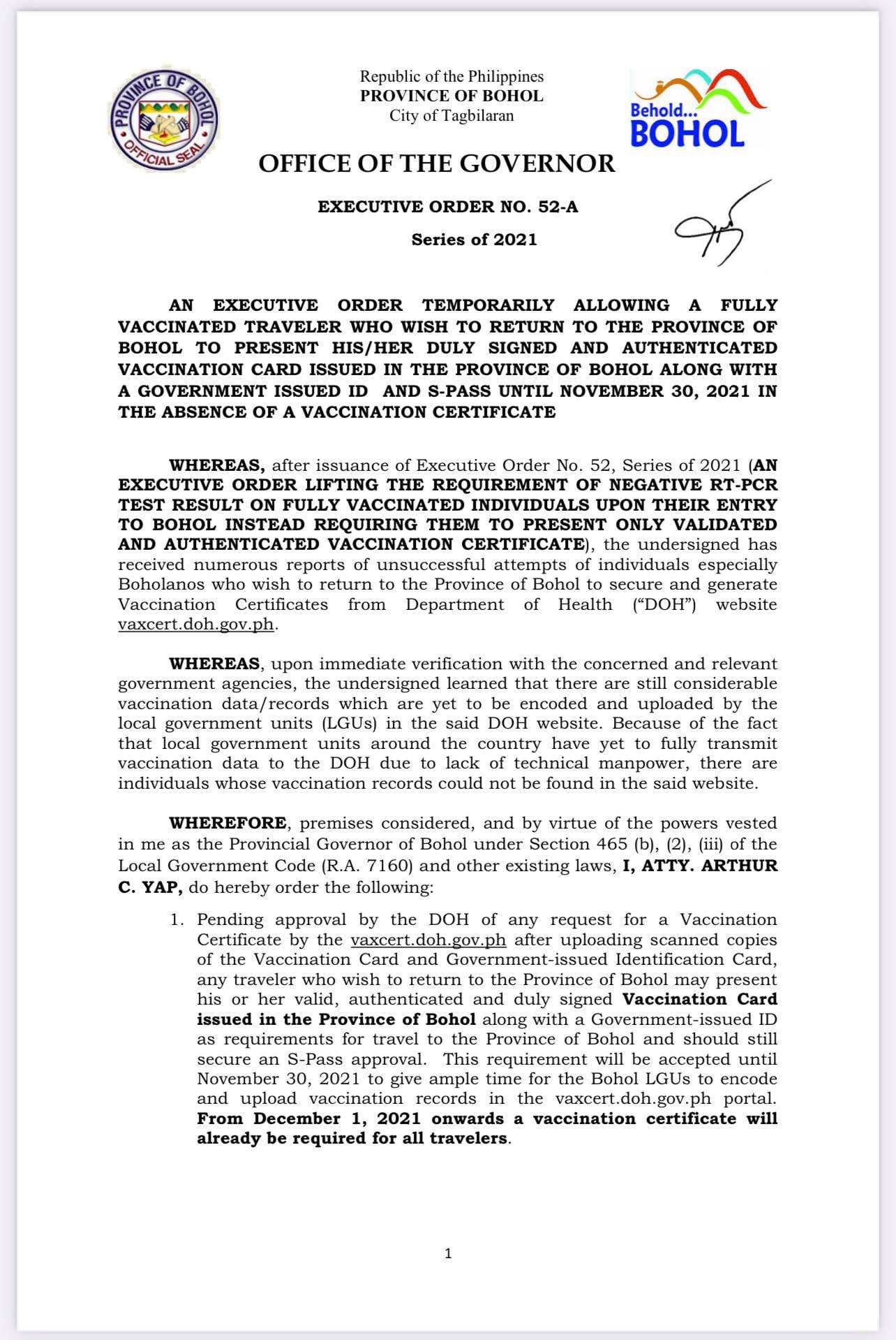 지난 금요일, 보홀 주지사 아서 얍(Arthur Yap)은 코로나19 예방접종완료자에 대해 코로나19 음성확인서의 제출을 면제해주겠다고 밝혔다. 관련 행정명령(EO)에 따르면, 디지털 예방접종 증명서(VaxCertPH)를 제시한 경우 음성확인서 제출이 면제된다. 코로나19 백신 예방접종을 하지 않았거나, 2회 접종이 필요한 백신을 1차 접종만 한 경우에도 보홀 방문이 가능하지만, 대신 코로나19 음성확인서를 제출해야만 한다.