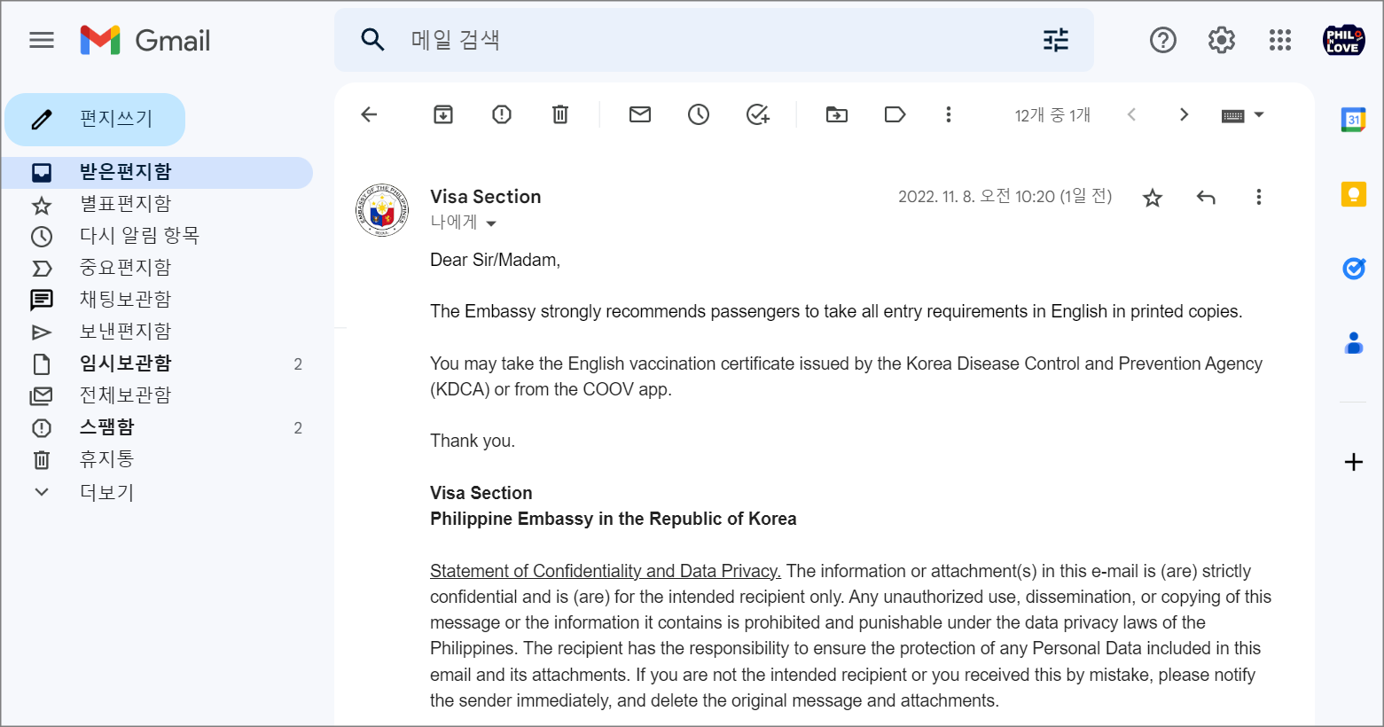 필리핀 입국 시 쿠브(COOV) 앱을 백신접종증명 목적으로 사용할 수 있을까?