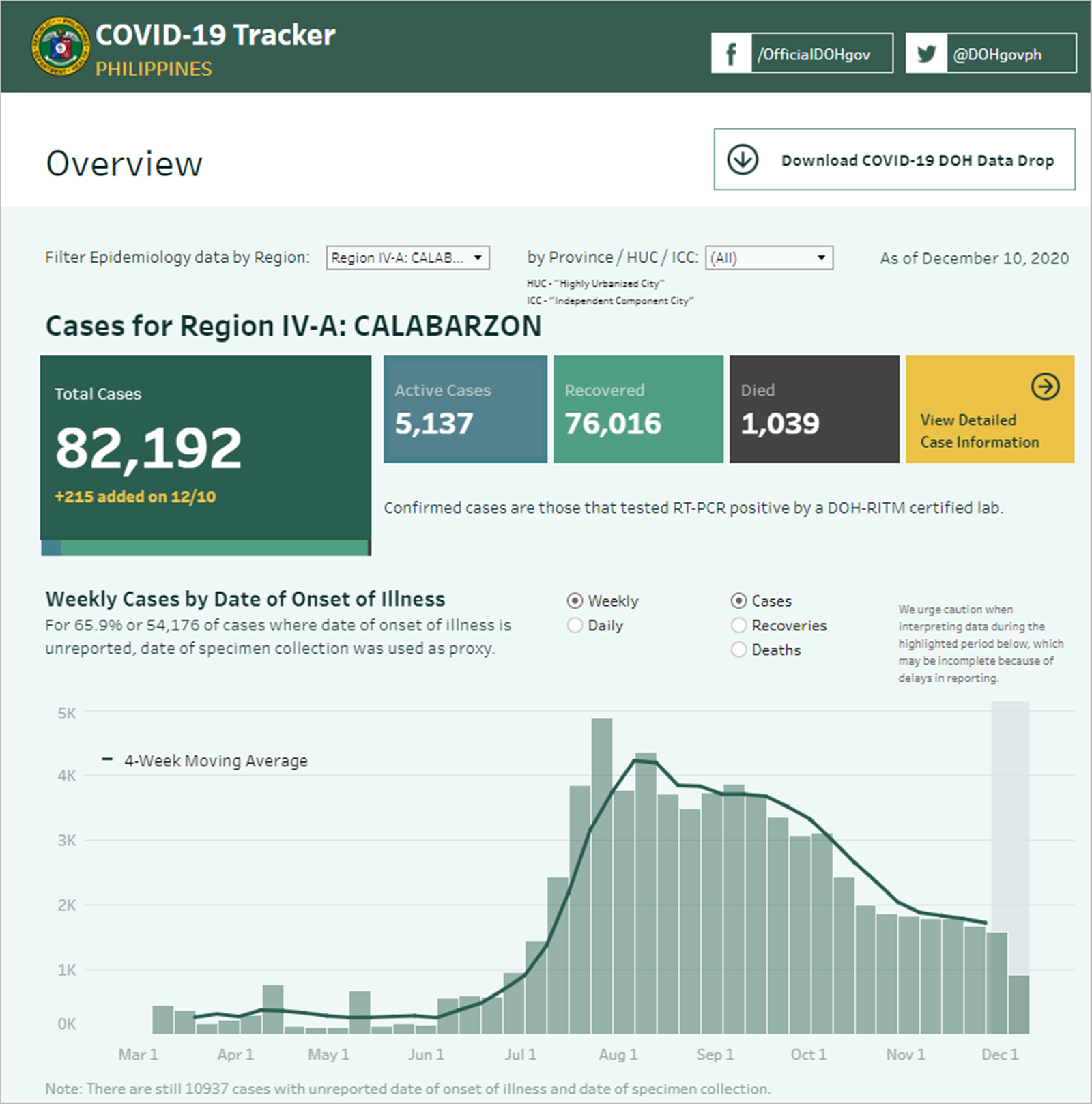 이 자료는 필리핀 보건부의 COVID-19 Tracker 발표를 기준으로 정리되었다. 주(Province) 또는 시(City)에서 발표하는 현황과 차이가 있을 수 있다.