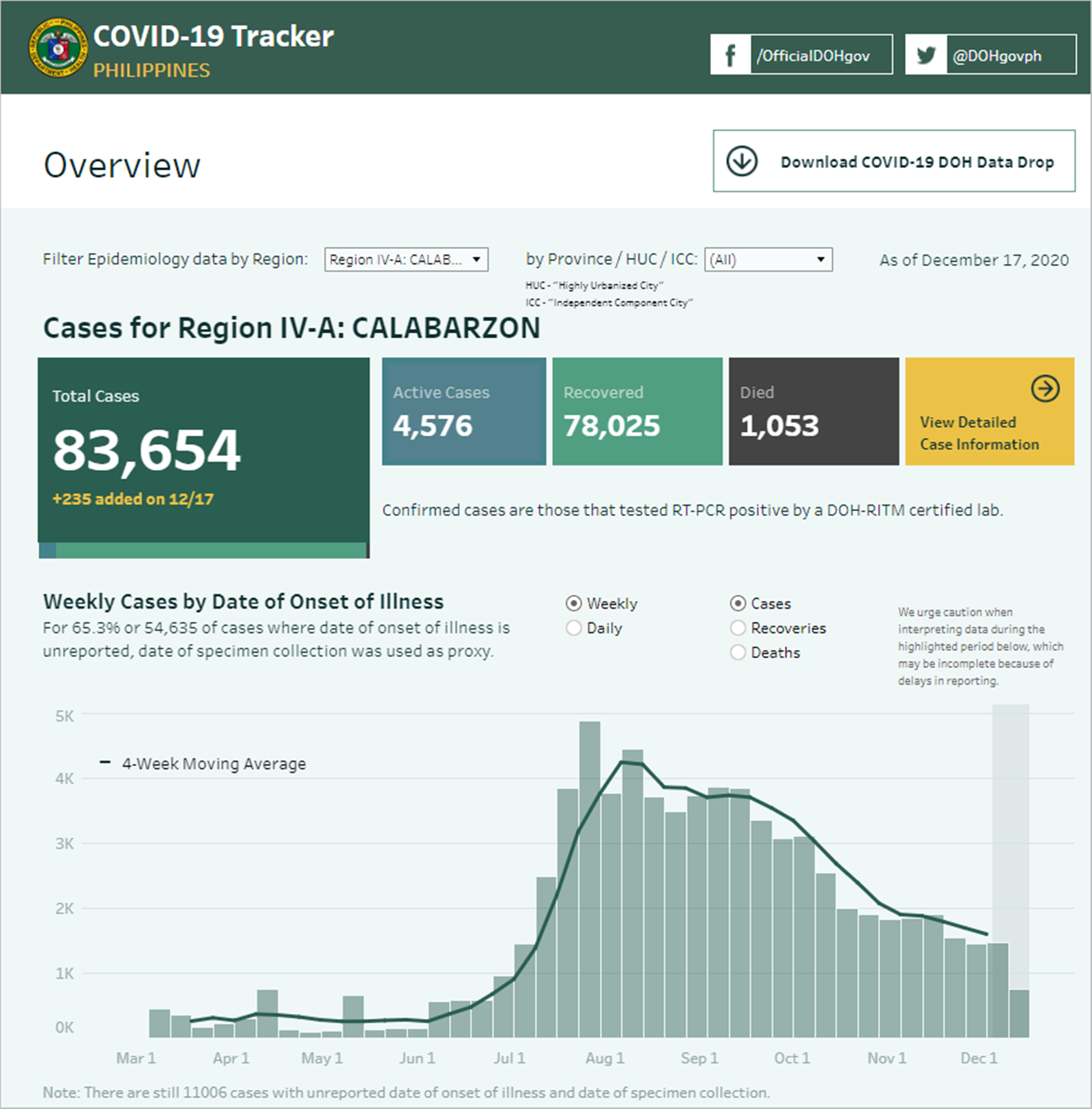 이 자료는 필리핀 보건부의 COVID-19 Tracker 발표를 기준으로 정리되었다. 주(Province) 또는 시(City)에서 발표하는 현황과 차이가 있을 수 있다.