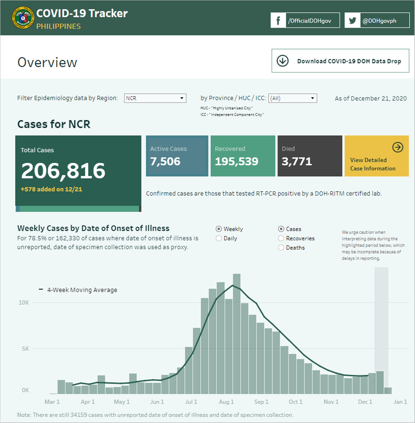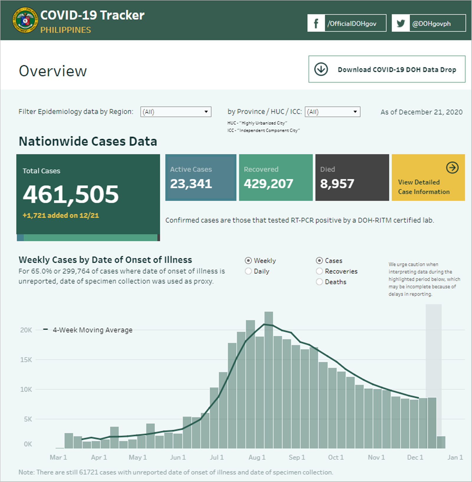 이 자료는 필리핀 보건부의 COVID-19 Tracker 발표를 기준으로 정리되었다. 주(Province) 또는 시(City)에서 발표하는 현황과 차이가 있을 수 있다.