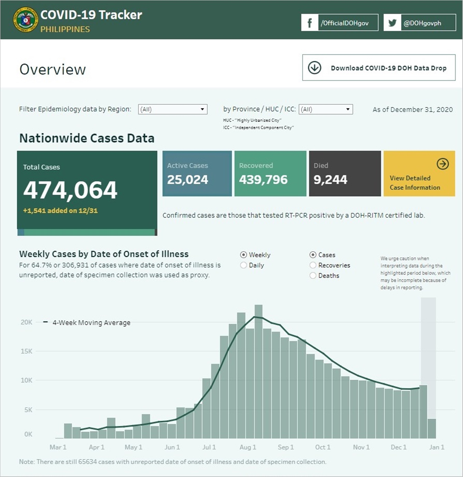 이 자료는 필리핀 보건부의 COVID-19 Tracker 발표를 기준으로 정리되었다. 주(Province) 또는 시(City)에서 발표하는 현황과 차이가 있을 수 있다.