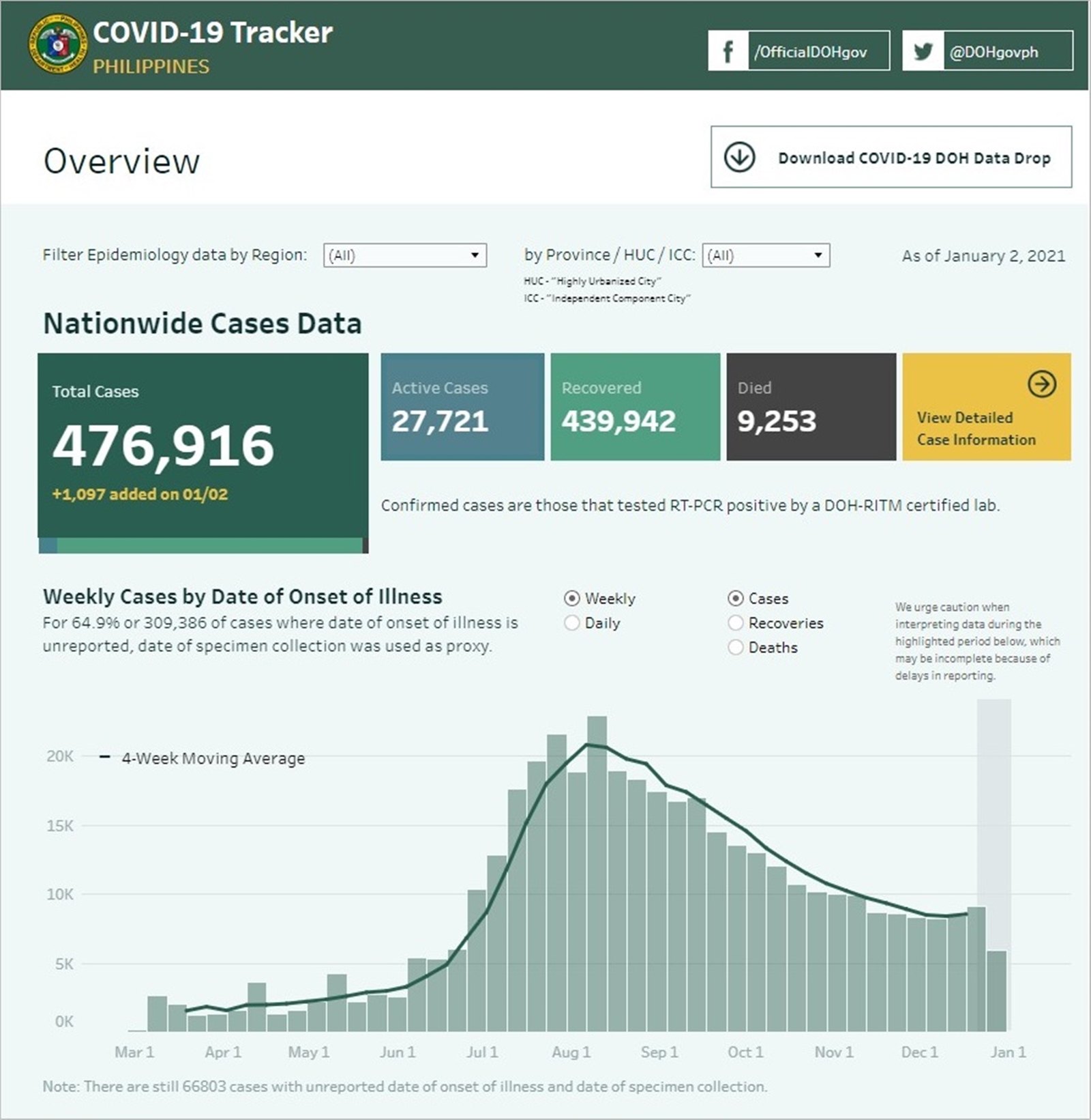 이 자료는 필리핀 보건부의 COVID-19 Tracker 발표를 기준으로 정리되었다. 주(Province) 또는 시(City)에서 발표하는 현황과 차이가 있을 수 있다.