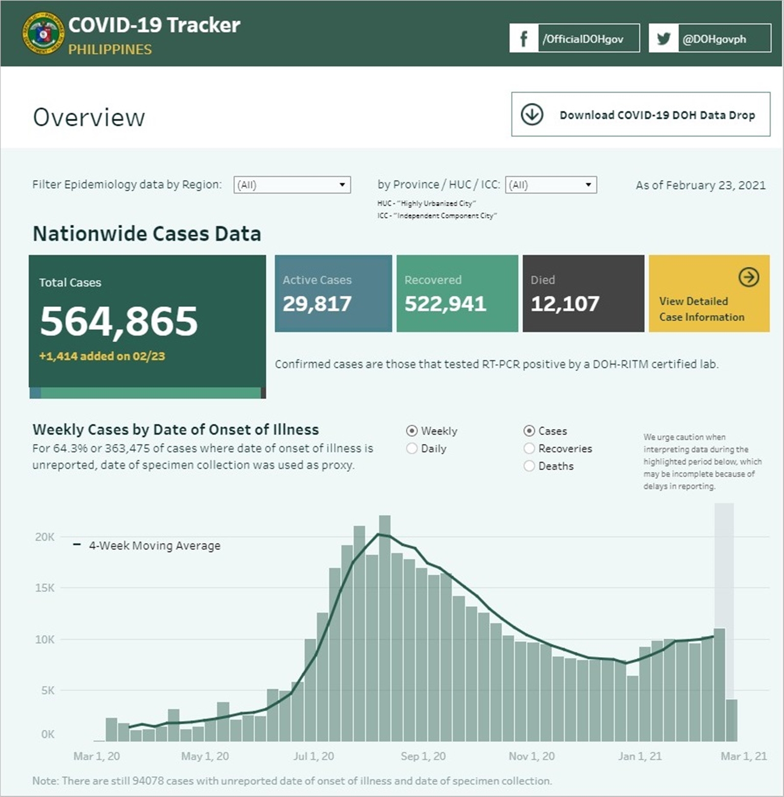 이 자료는 필리핀 보건부의 COVID-19 Tracker 발표를 기준으로 정리되었다. 주(Province) 또는 시(City)에서 발표하는 현황과 차이가 있을 수 있다.