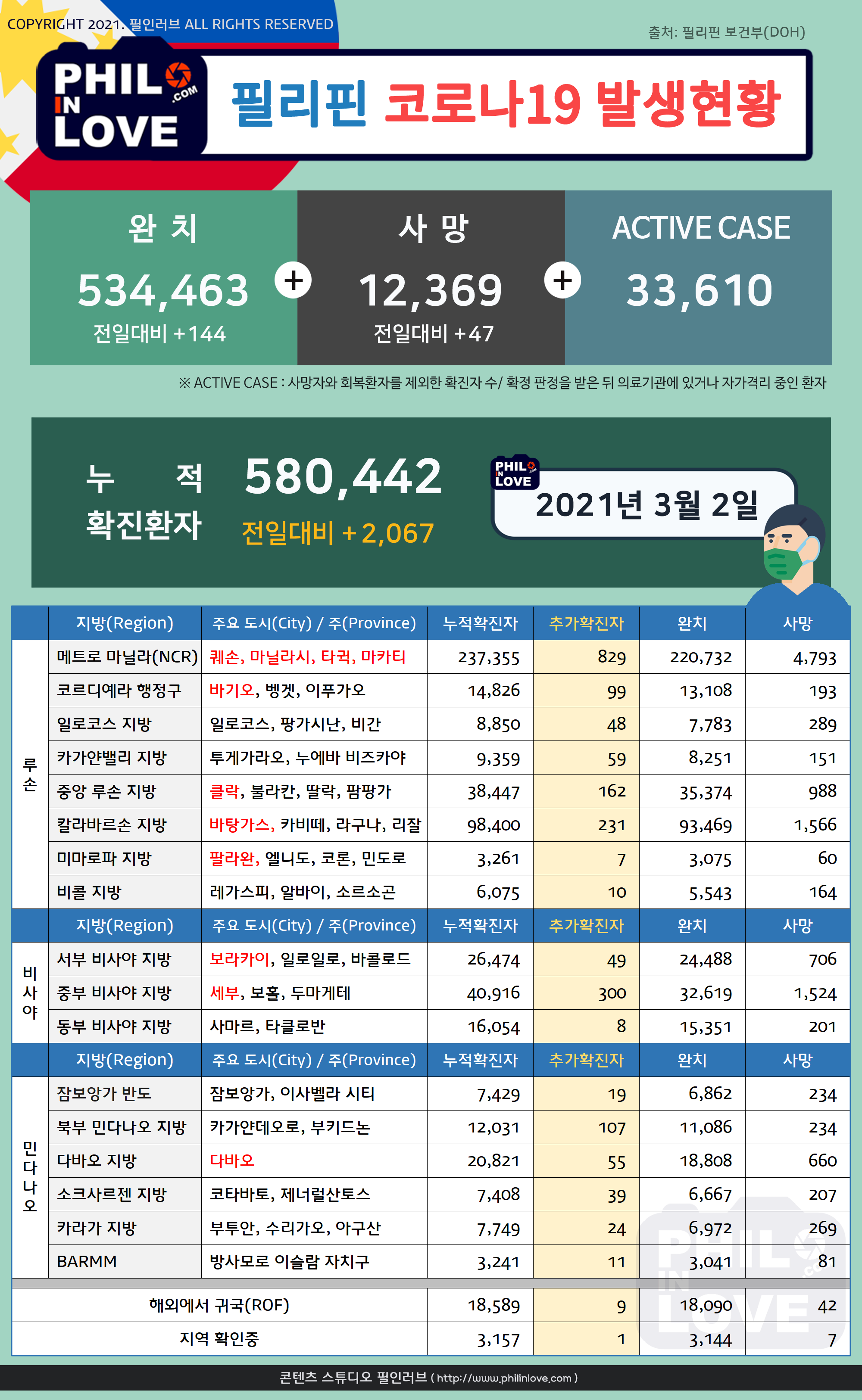 이 자료는 필리핀 보건부의 COVID-19 Tracker 발표를 기준으로 정리되었다. 주(Province) 또는 시(City)에서 발표하는 현황과 차이가 있을 수 있다.