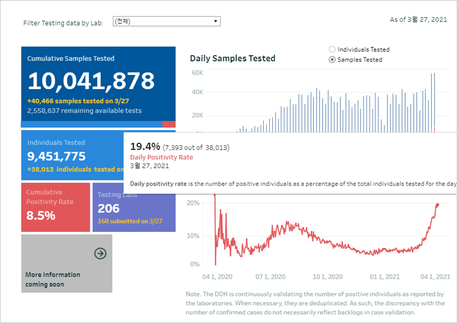 - 누적검사수(cumulative sample tested) : 10,041,878