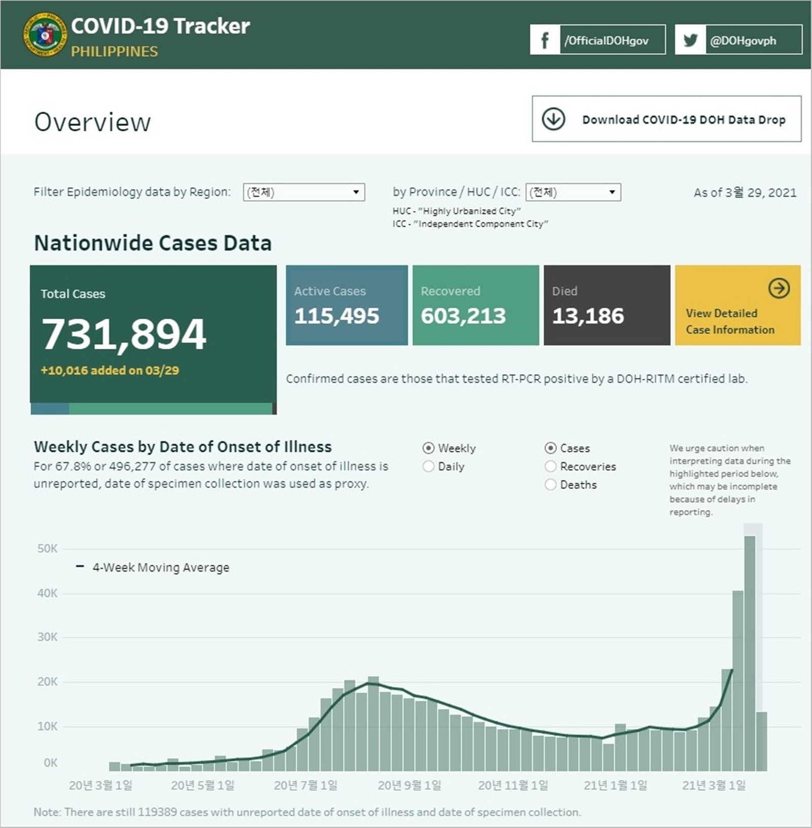이 자료는 필리핀 보건부의 COVID-19 Tracker 발표를 기준으로 정리되었다. 주(Province) 또는 시(City)에서 발표하는 현황과 차이가 있을 수 있다.