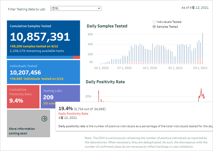 - 누적검사수(cumulative sample tested) : 10,857,391