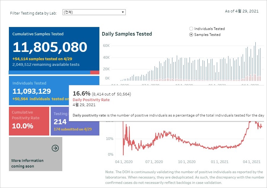 - 누적검사수(cumulative sample tested) : 11,805,080