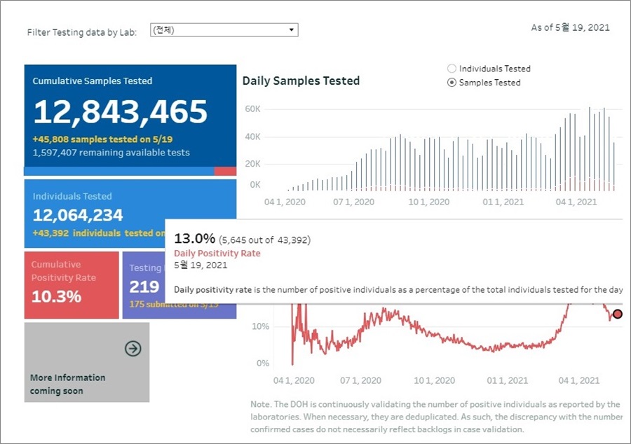 - 누적검사수(cumulative sample tested) : 12,843,465