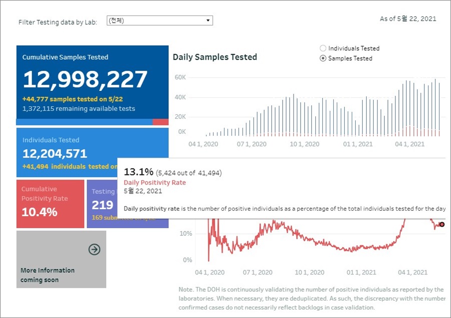 - 누적검사수(cumulative sample tested) : 12,998,227