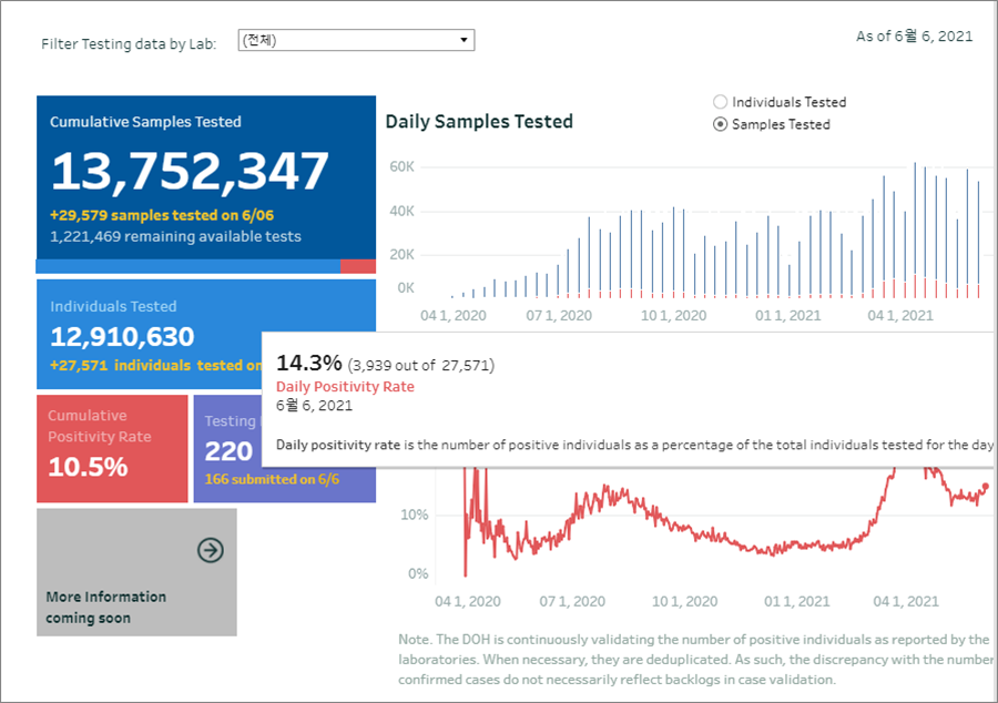 - 누적검사수(cumulative sample tested) : 13,752,347