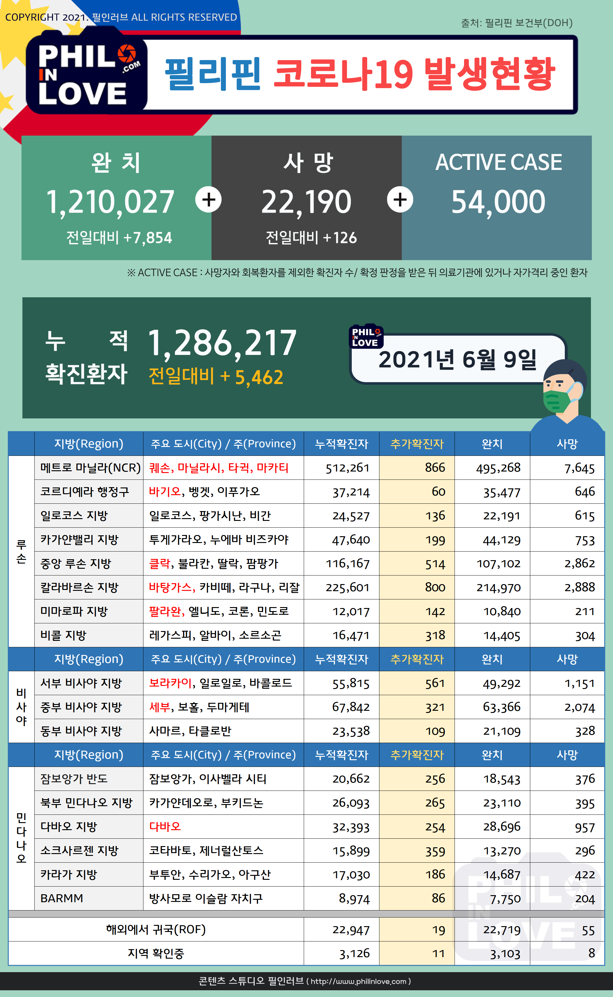 | 필리핀 코로나19 확진자 현황 지역별 보기 (2021년 6월 8일 현재) (0) | 2021.06.08 |