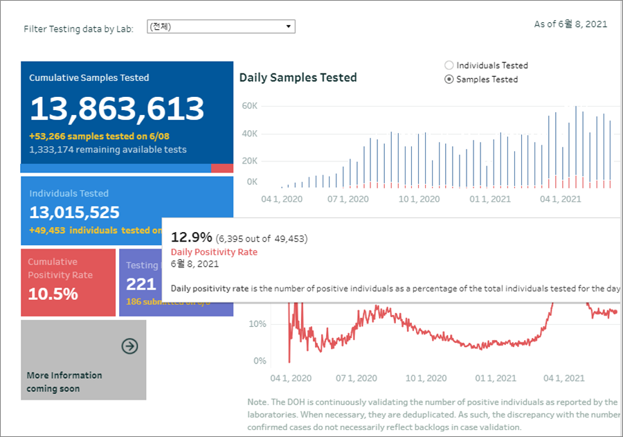 - 누적검사수(cumulative sample tested) : 13,863,613