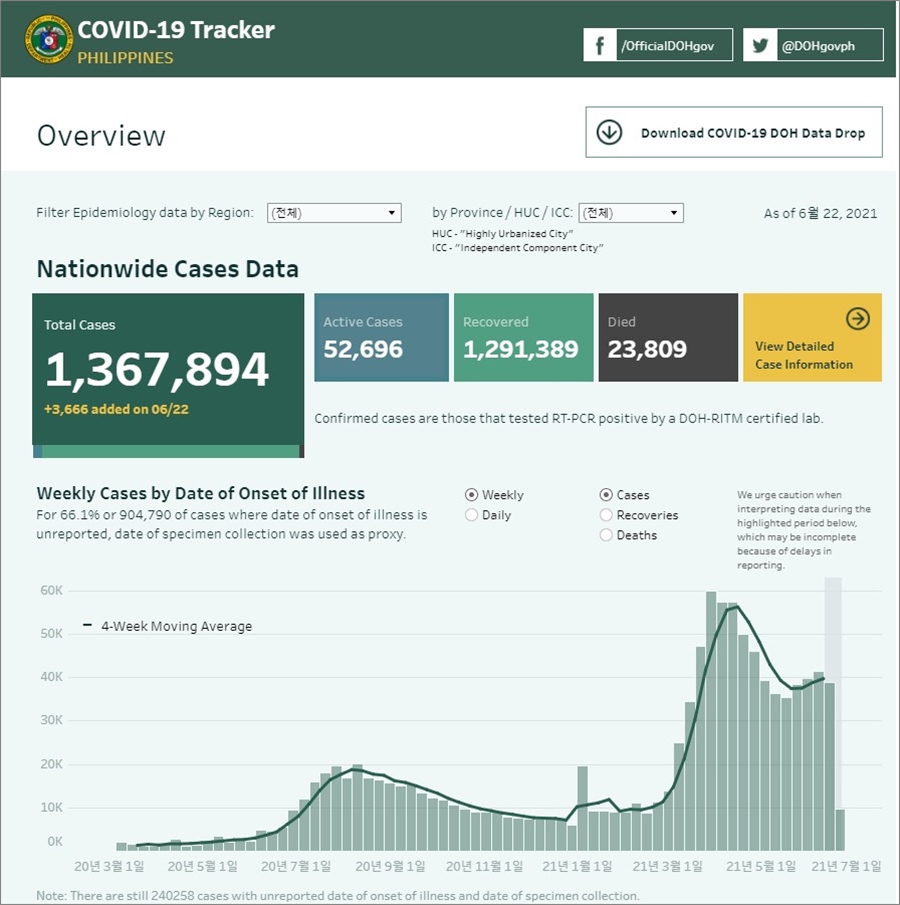 | 필리핀 코로나19 확진자 현황 지역별 보기 (2021년 6월 23일 현재) (0) | 2021.06.23 |