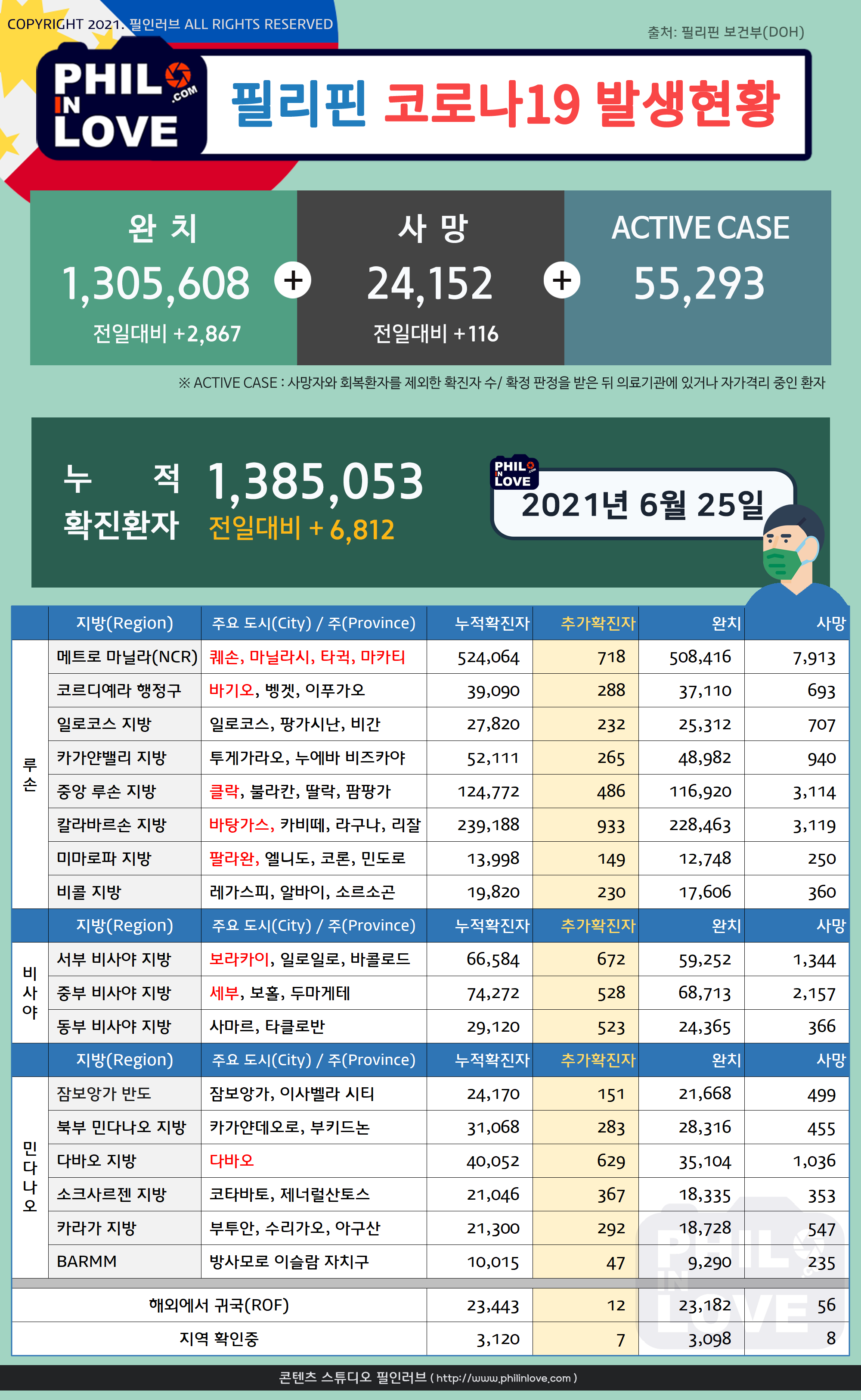 필리핀 코로나19 확진자 현황 지역별 보기 (2021년 6월 24일 현재) (0) | 2021.06.24 |
