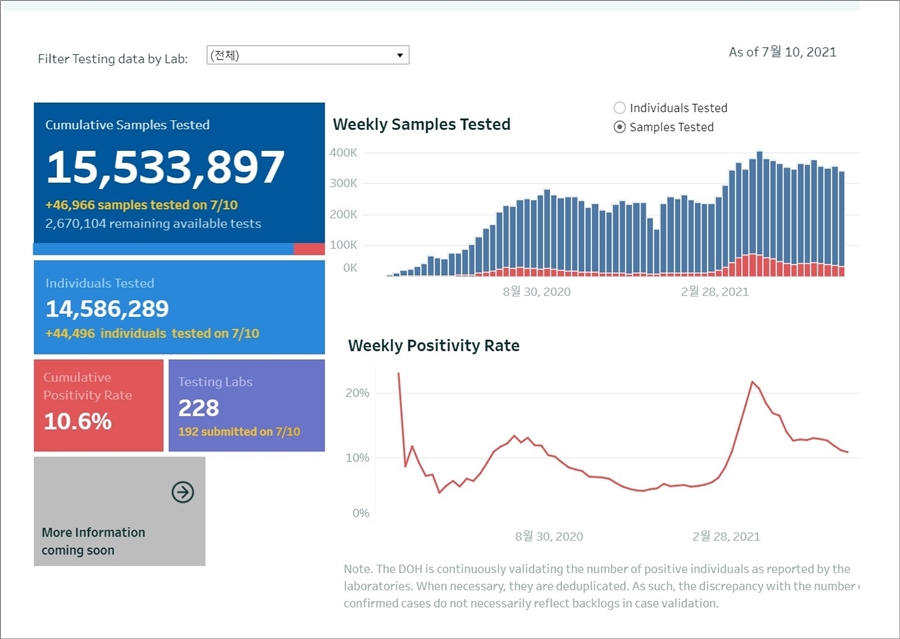 주의 : 이곳에 기재된 내용은 필리핀 보건부의 COVID-19 Tracker 발표 자료를 근거로 기재되었으며, 개인적으로 취합한 내용이라 수치의 정확성에 대해 책임질 수 없습니다. 또한 주(Province) 또는 시(City)에서 발표하는 코로나 확진자 현황과 차이가 있을 수 있습니다.