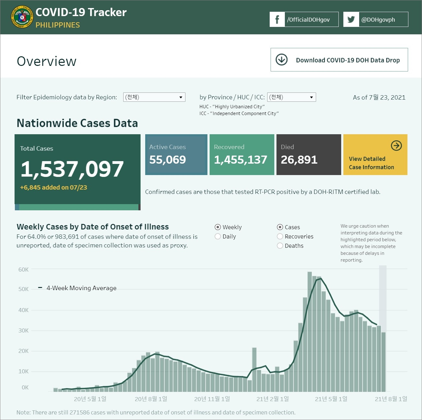 주의 : 이곳에 기재된 내용은 필리핀 보건부의 COVID-19 Tracker 발표 자료를 근거로 기재되었으며, 개인적으로 취합한 내용이라 수치의 정확성에 대해 책임질 수 없습니다. 또한 주(Province) 또는 시(City)에서 발표하는 코로나 확진자 현황과 차이가 있을 수 있습니다.