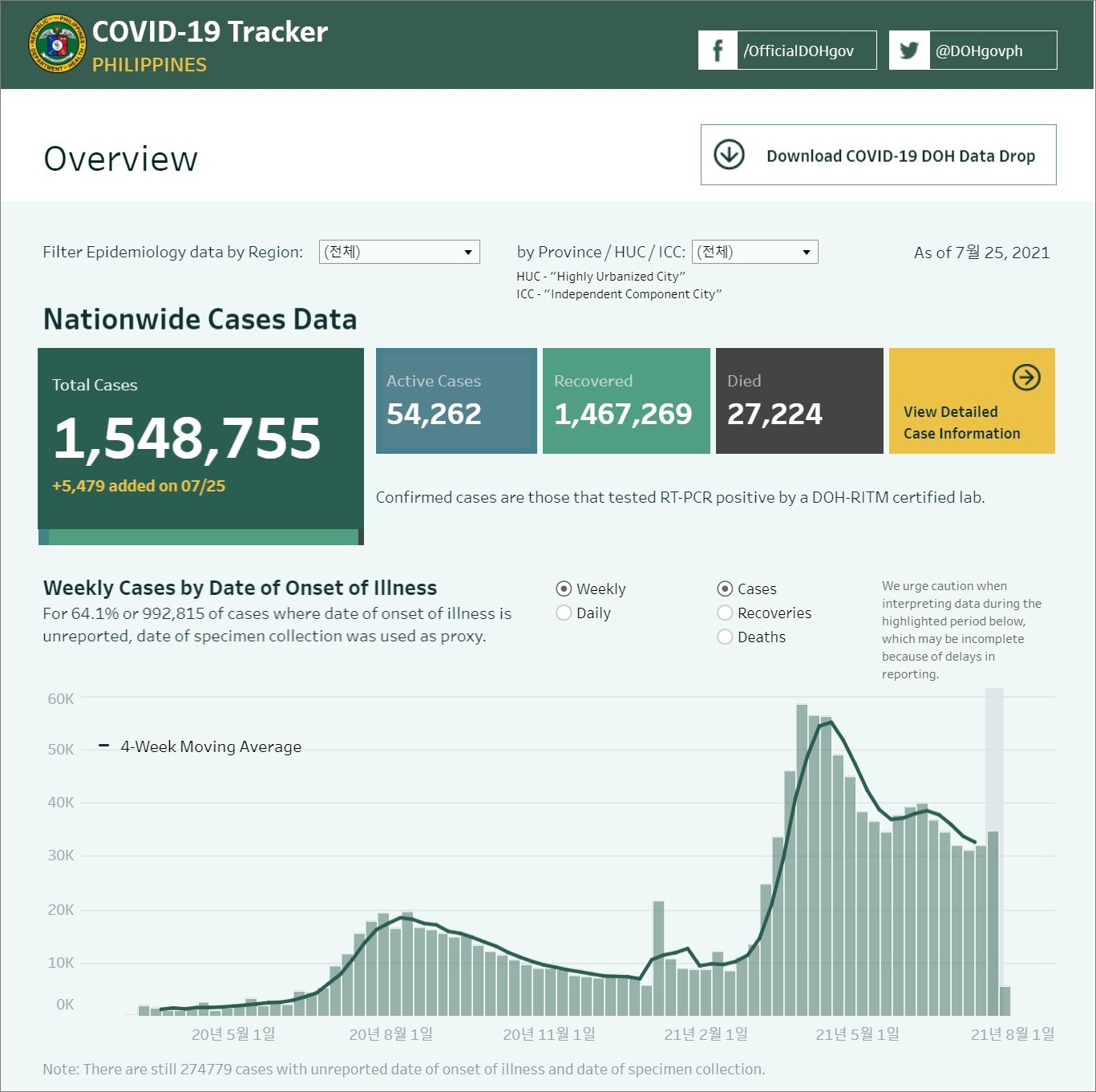 주의 : 이곳에 기재된 내용은 필리핀 보건부의 COVID-19 Tracker 발표 자료를 근거로 기재되었으며, 개인적으로 취합한 내용이라 수치의 정확성에 대해 책임질 수 없습니다. 또한 주(Province) 또는 시(City)에서 발표하는 코로나 확진자 현황과 차이가 있을 수 있습니다.