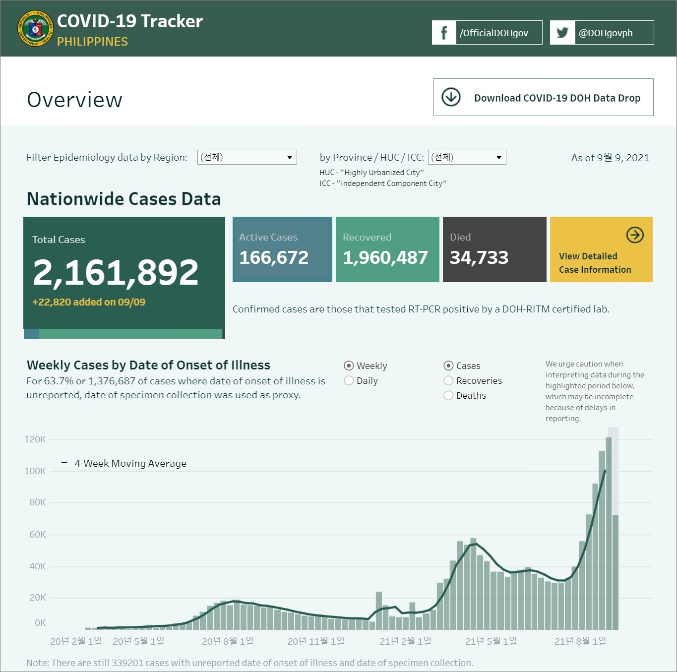 주의 : 이곳에 기재된 내용은 필리핀 보건부의 COVID-19 Tracker 발표 자료를 근거로 기재되었으며, 개인적으로 취합한 내용이라 수치의 정확성에 대해 책임질 수 없습니다. 또한 주(Province) 또는 시(City)에서 발표하는 코로나 확진자 현황과 차이가 있을 수 있습니다.
