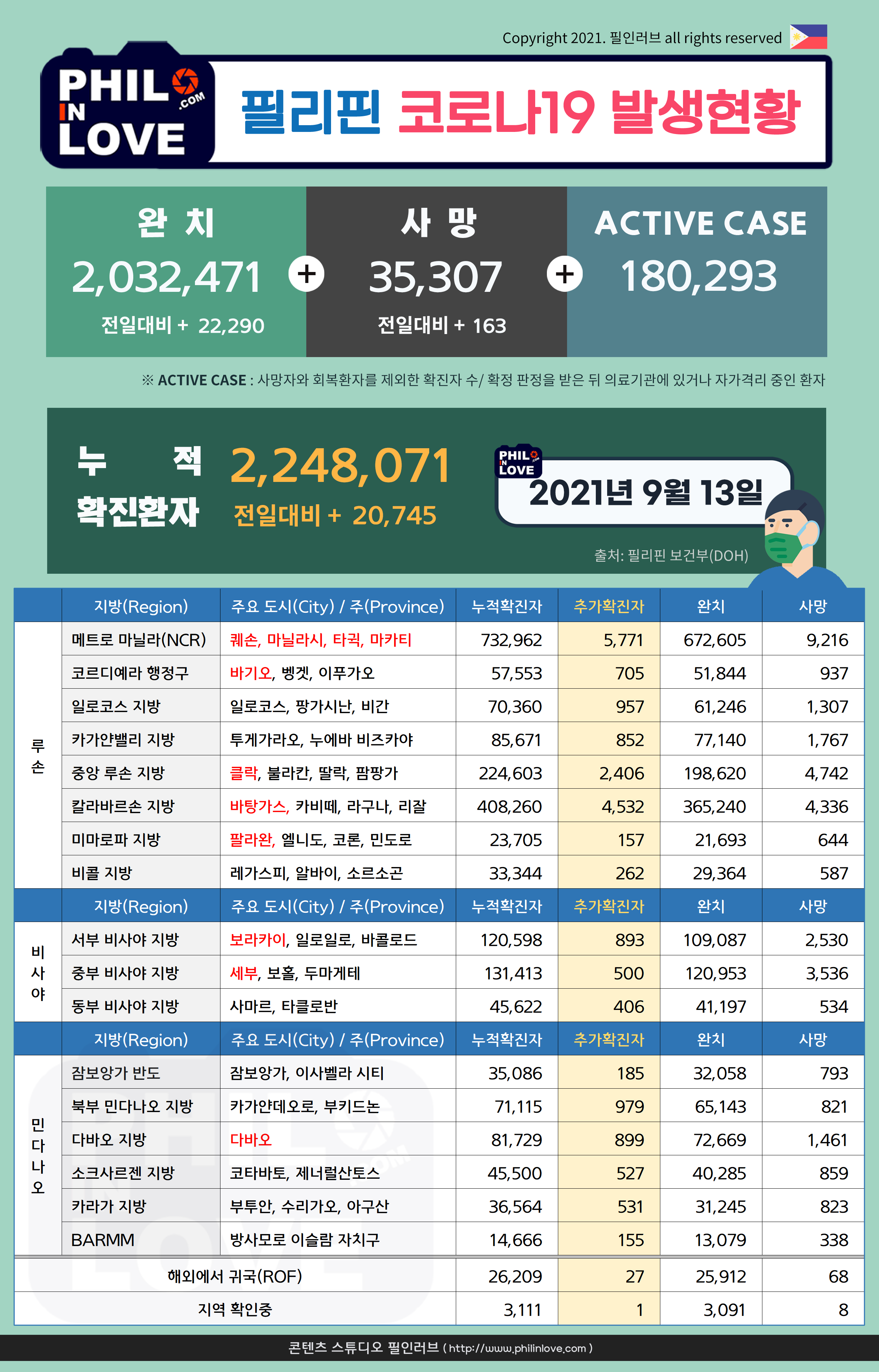 | 필리핀 코로나19 확진자 현황 지역별 보기 (2021년 9월 11일 현재) (0) | 2021.09.12 |