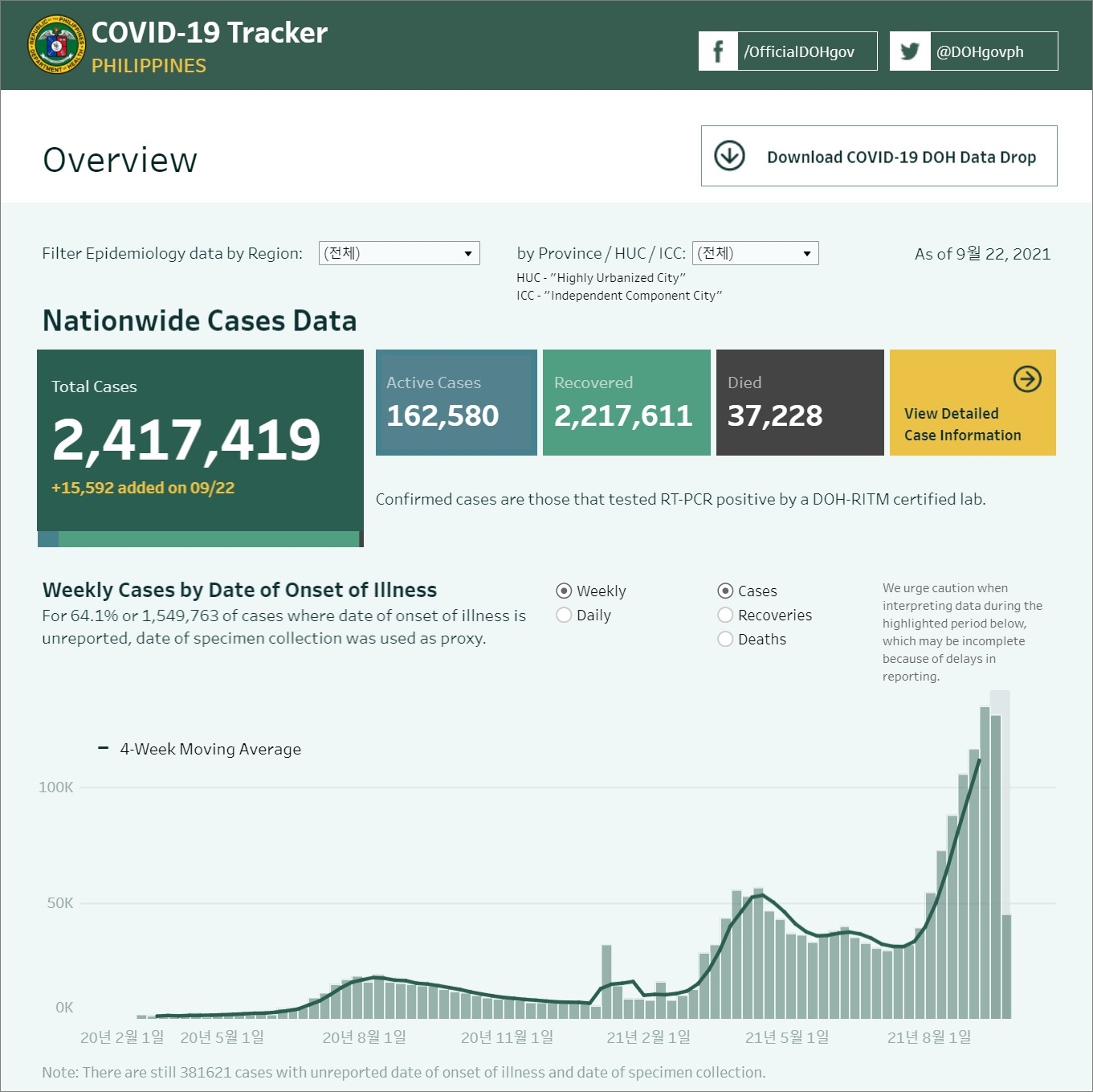 필리핀 코로나19 확진자 현황 지역별 보기 (2021년 9월 22일 현재)