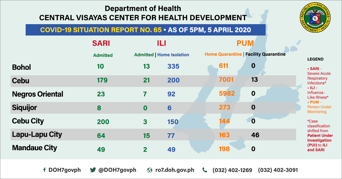 - 4월 5일 현재 필리핀 비사야 지역 내 코로나바이러스감염증-19(코로나19) 확진자 현황은 아래와 같다. 아래 표는 보건부에서 운영하는 각 지역사무소(보건청)에서 발표한 자료를 기준으로 정리한 것으로 필리핀 보건부(DOH)의 발표 자료와 차이가 있다.