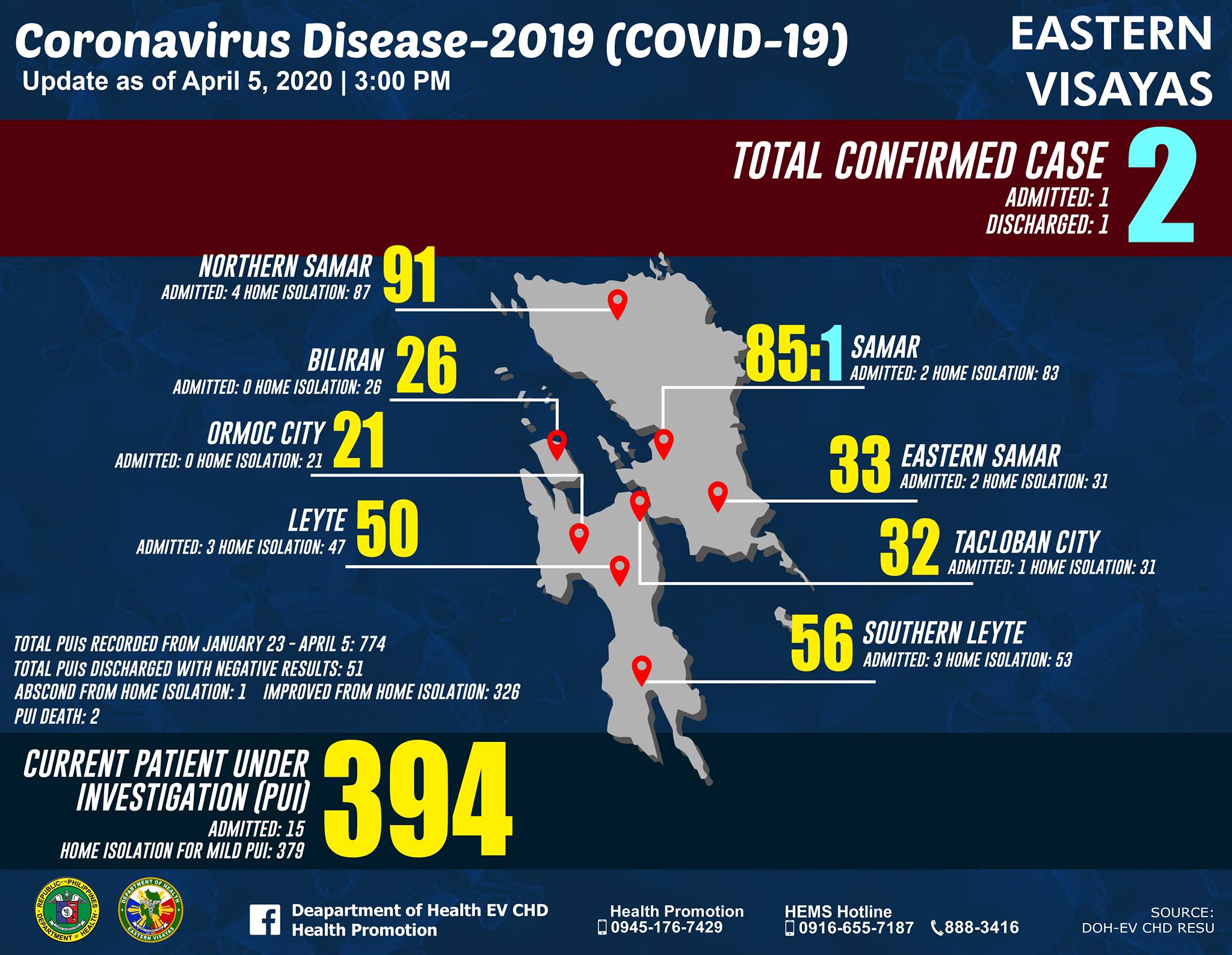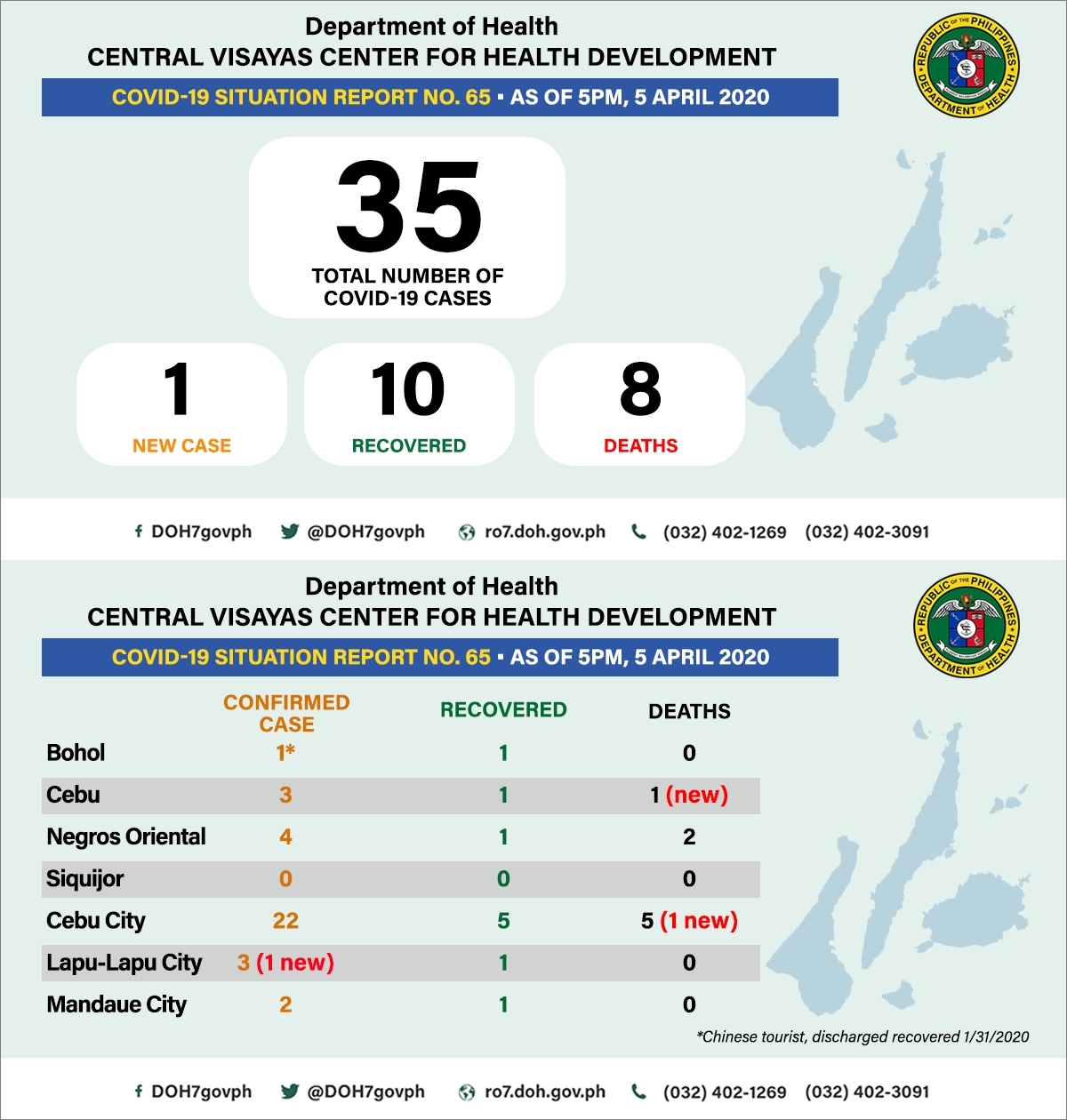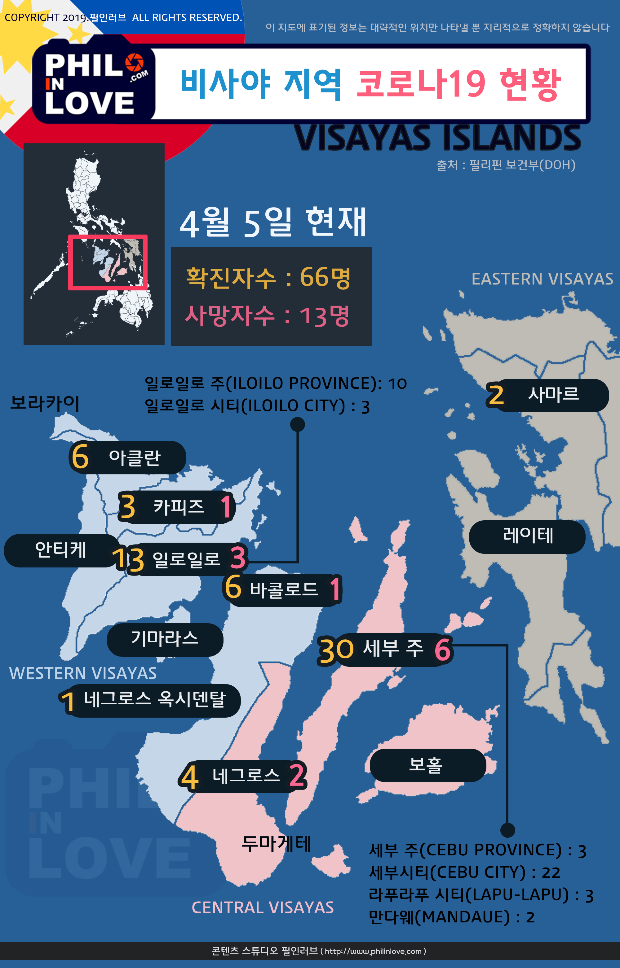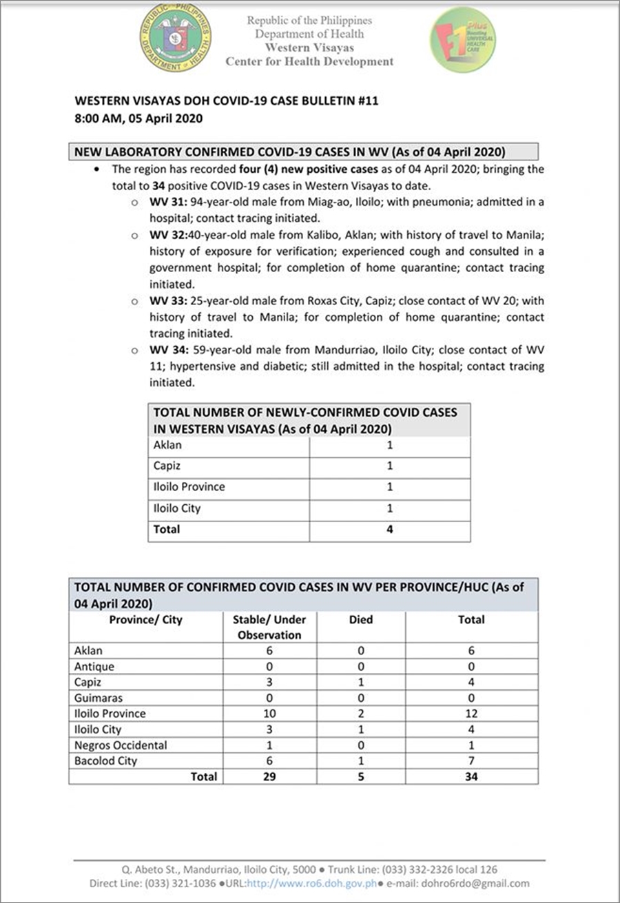 - 4월 5일 현재 필리핀 비사야 지역 내 코로나바이러스감염증-19(코로나19) 확진자 현황은 아래와 같다. 아래 표는 보건부에서 운영하는 각 지역사무소(보건청)에서 발표한 자료를 기준으로 정리한 것으로 필리핀 보건부(DOH)의 발표 자료와 차이가 있다.