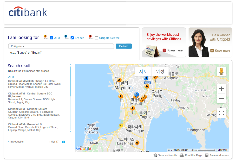 필리핀 씨티은행(Citibank) 지점 및 ATM 위치
