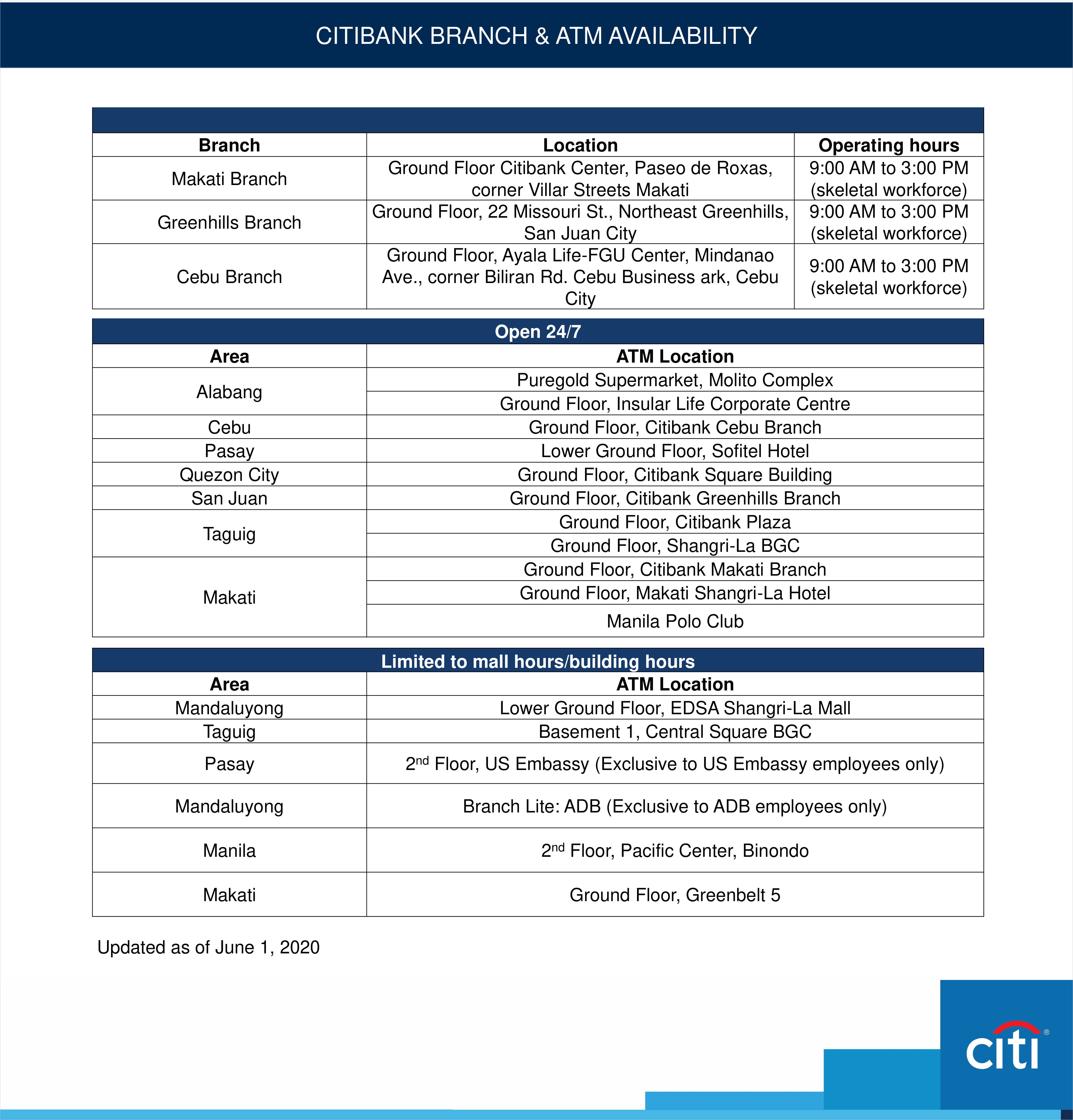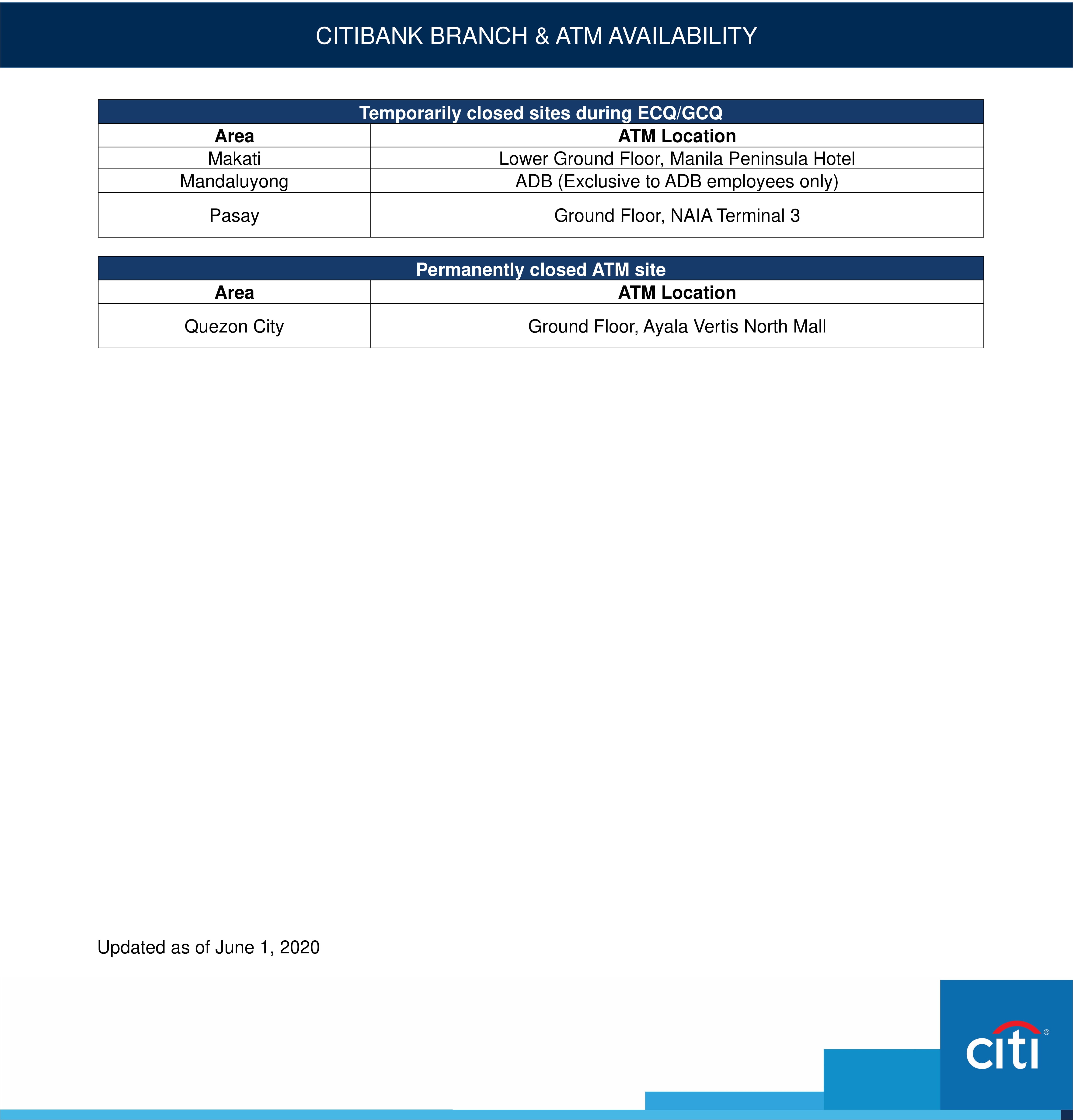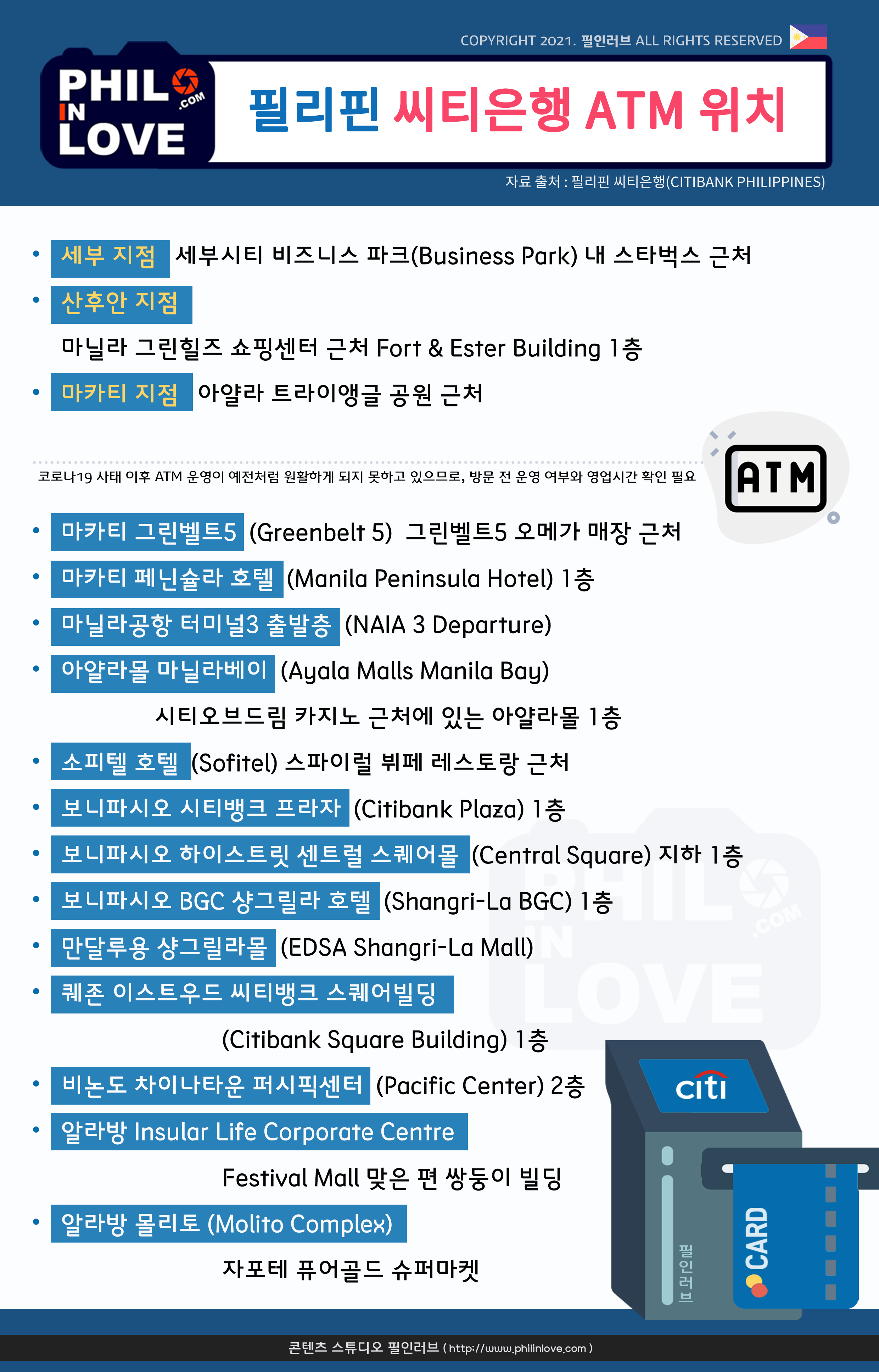 - 비고 : 씨티은행 홈페이지에서는 마카티 샹그릴라 호텔에 ATM이 있다고 안내하고 있으나, 호텔이 2021년 2월 1일부터 영업을 중단하여 호텔 내부에 들어갈 수 없는 상태임