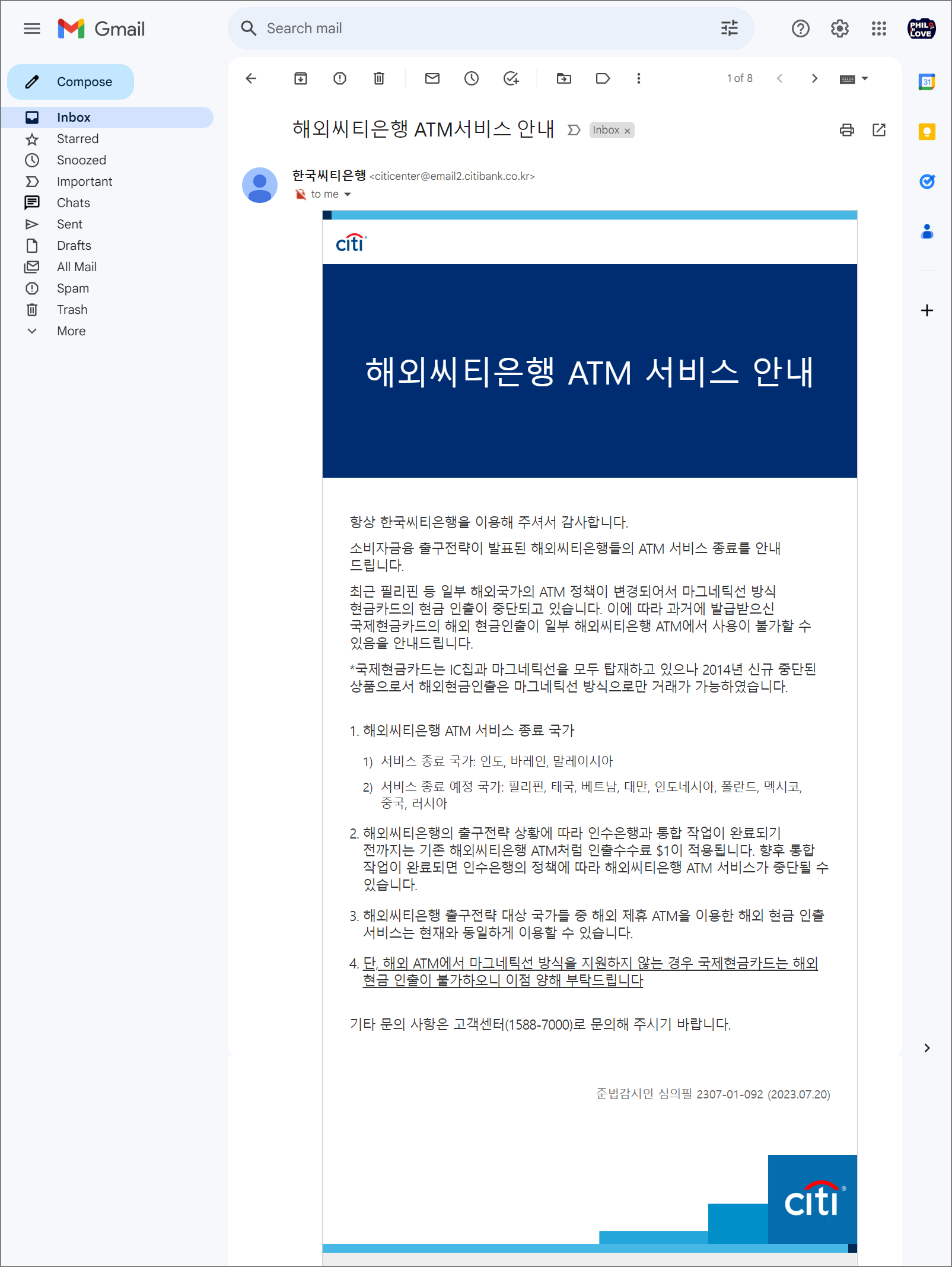 한국씨티은행에서 보낸 ATM서비스 종료에 대한 안내문