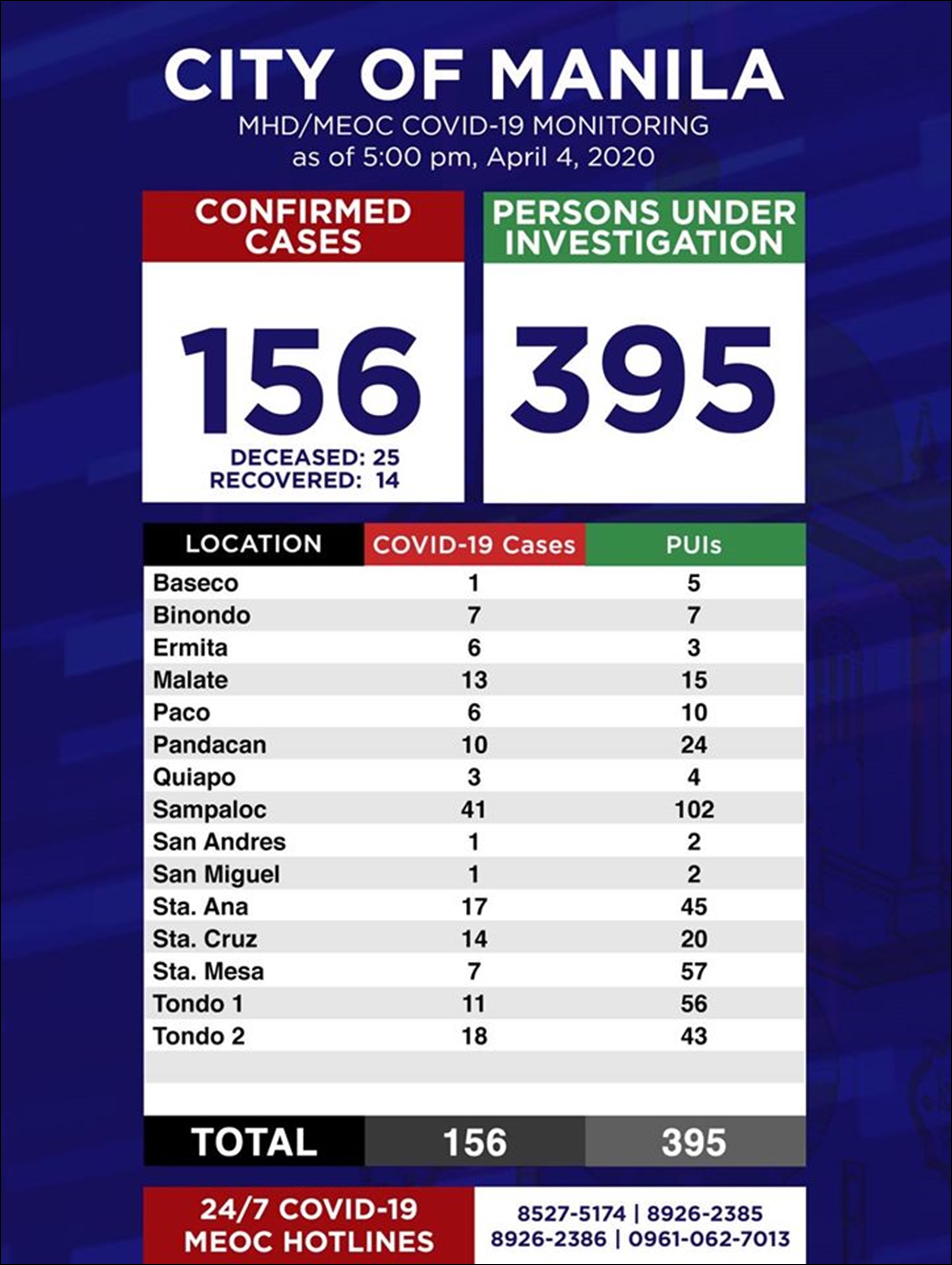 필리핀 보건부에서 발표한 자료에 따르면 4월 5일 현재 필리핀 내 코로나19 확진자 수는 3,246명이다. 확진자의 절반 가량은 메트로 마닐라 지역에 있다.