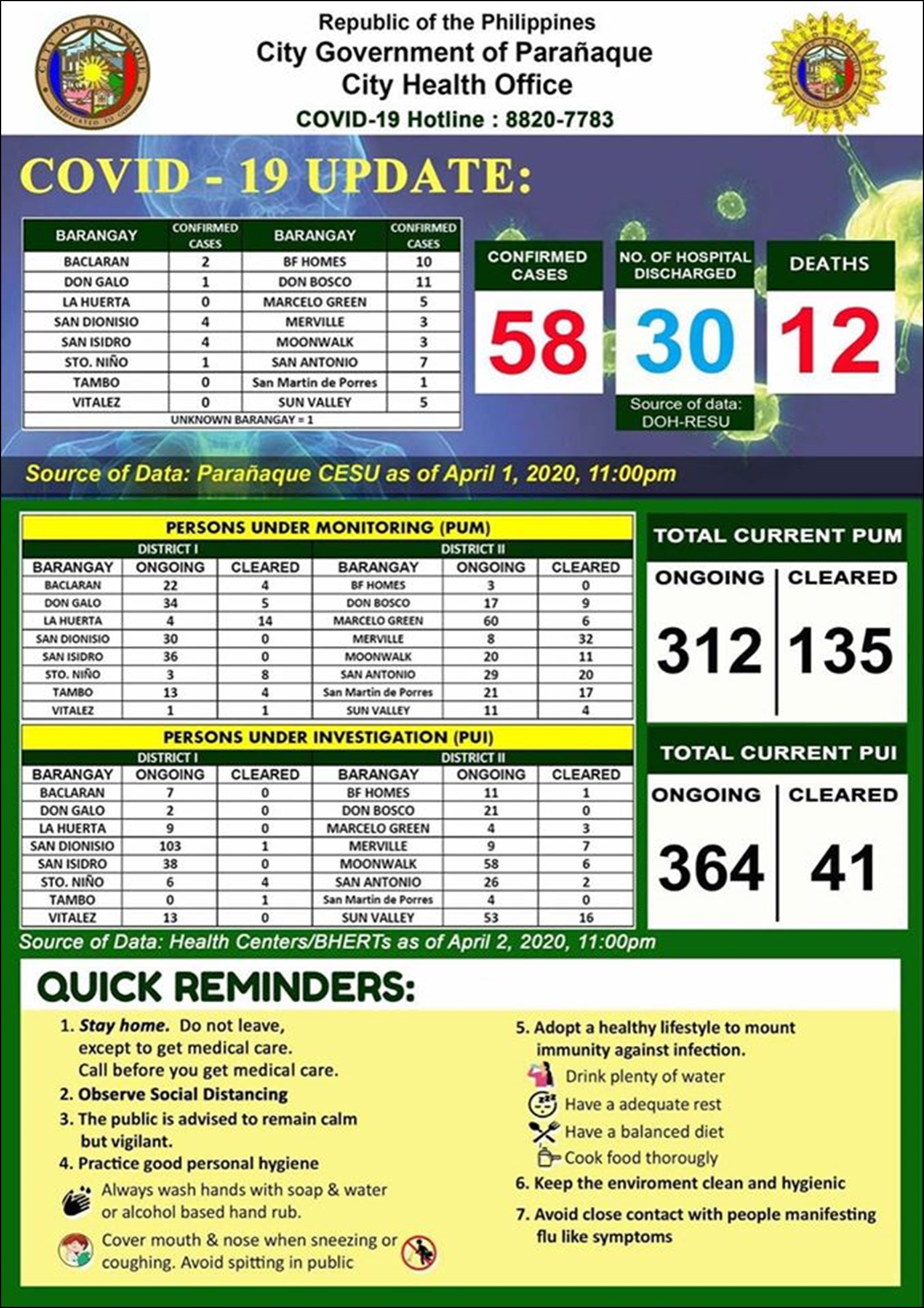 - 아래 자료에서 확진자 수(1,748명)는 필리핀 보건부의 자료와 각 시(City) 또는 구(Municipality)의 자료 중 숫자가 높은 것을 채택하여 더한 숫자이다.