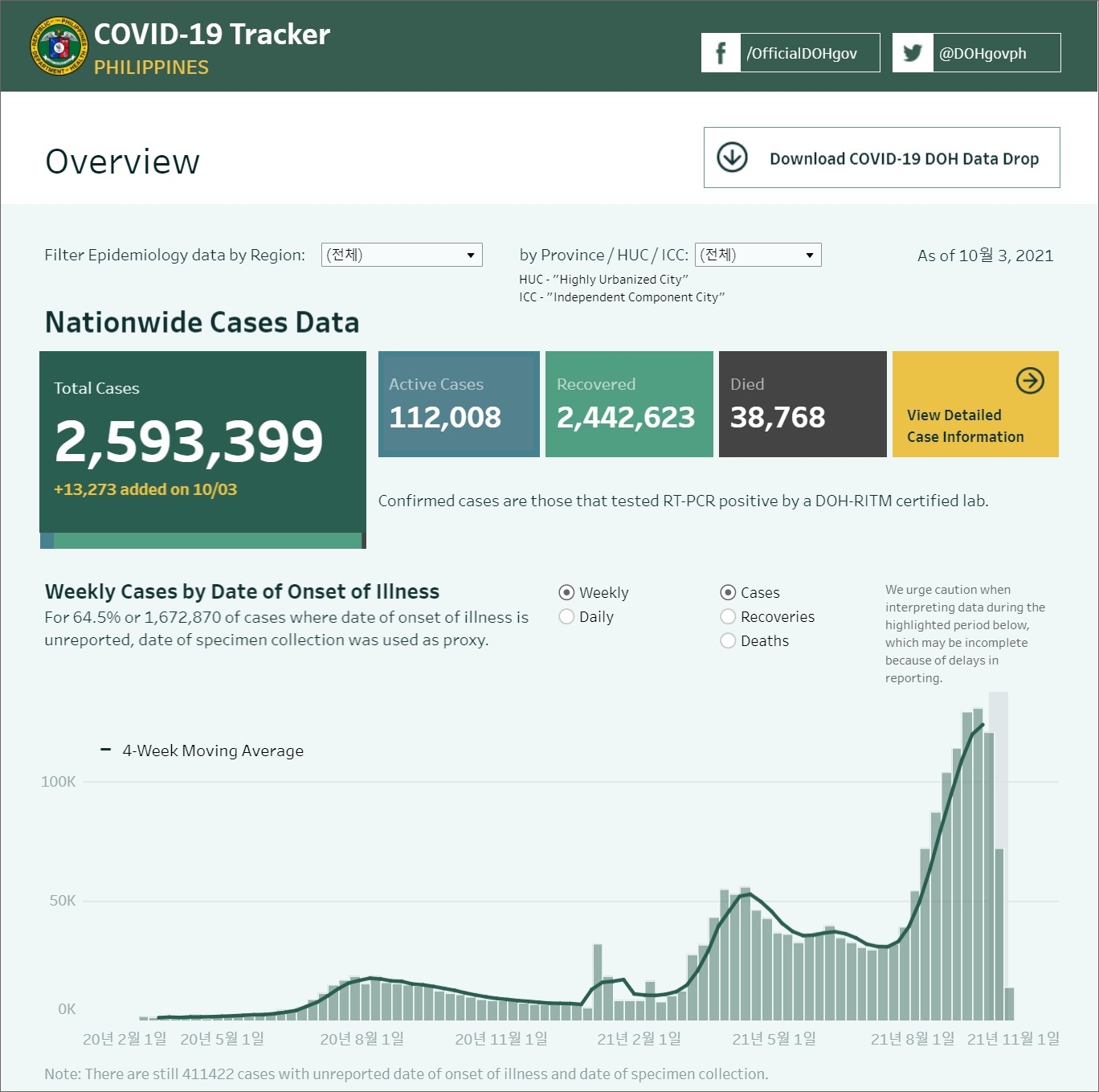 필리핀 코로나19 확진자 현황과 백신 예방접종 현황(2021년 10월 3일 현재)